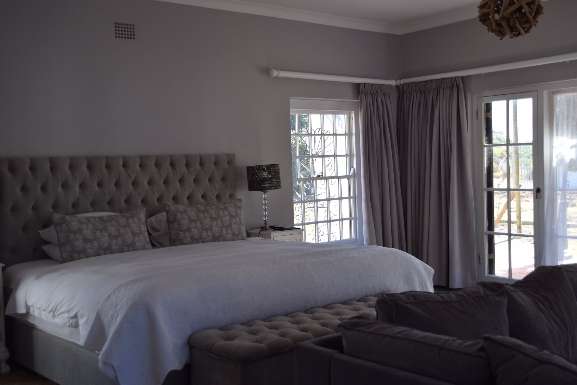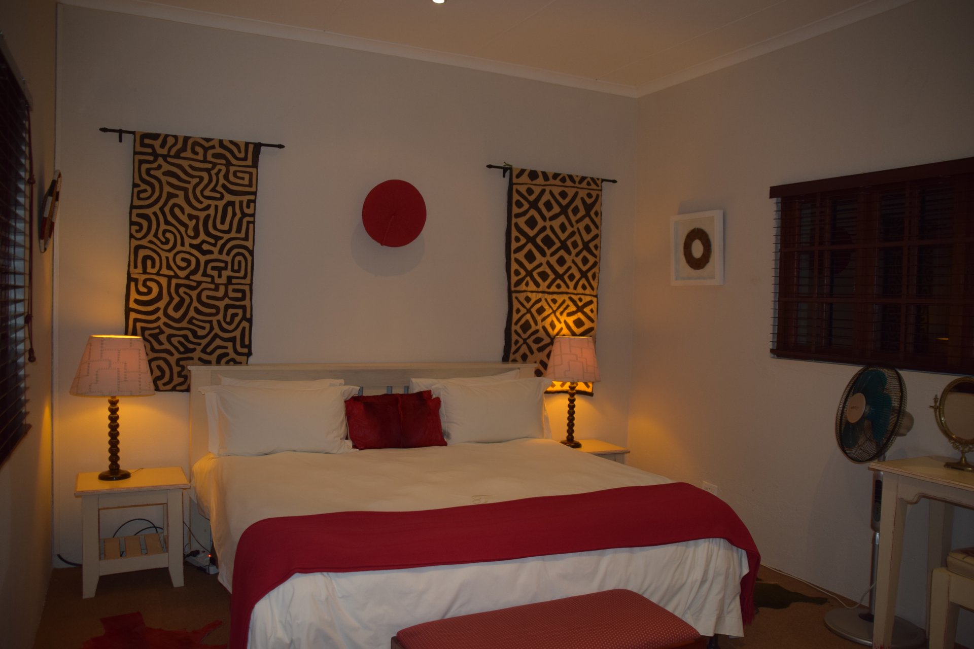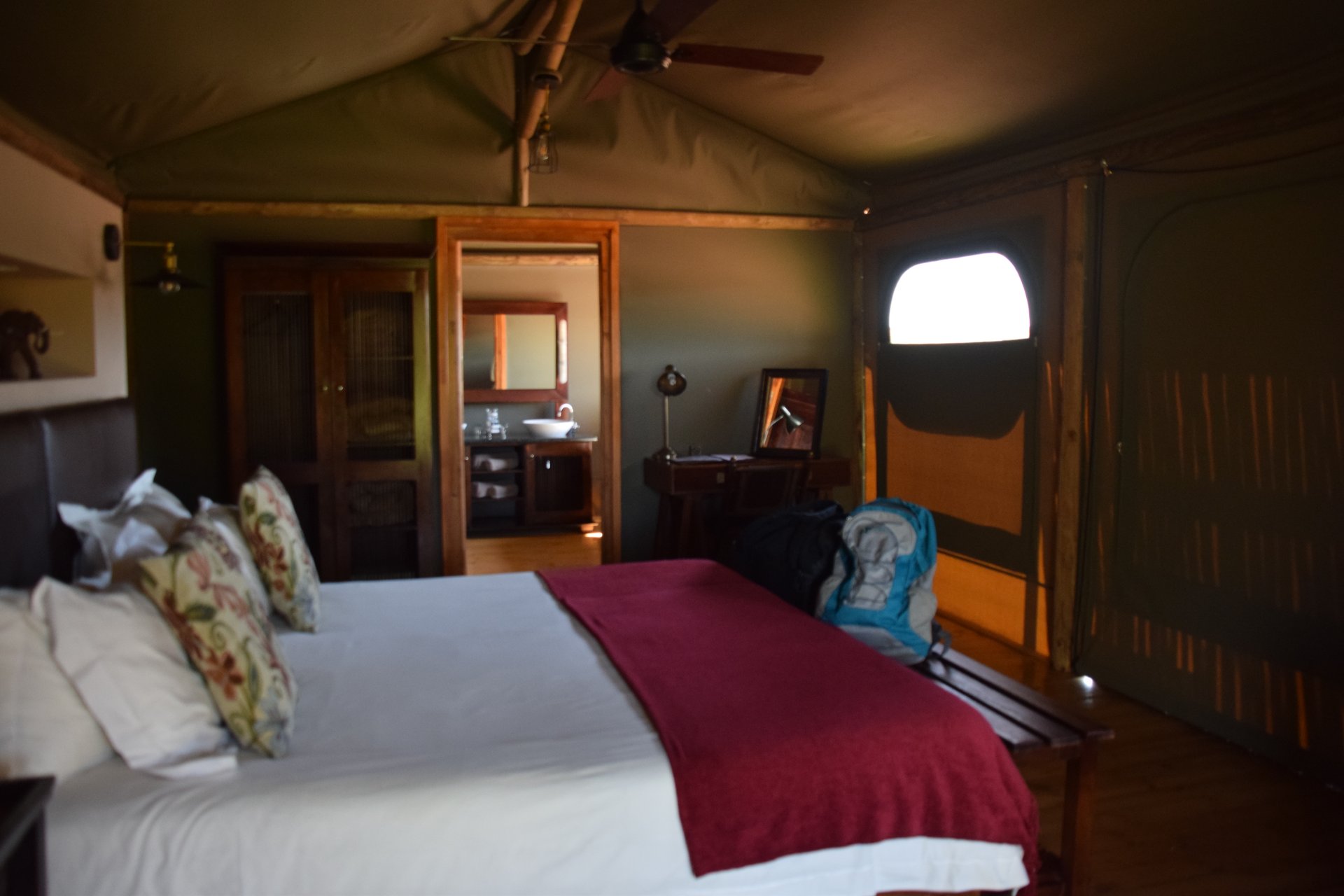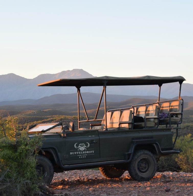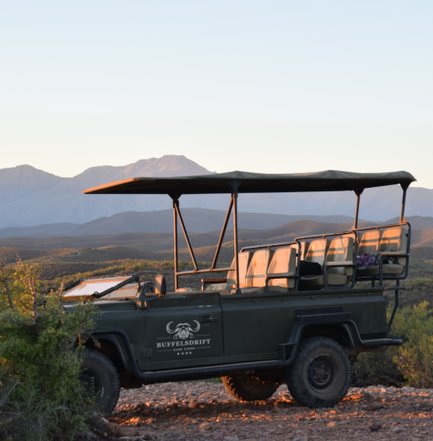 Am Rand des kleinen Städtchens Oudshoorn gelegen, mitten in einer von üppigem Grün bewachsenen Landschaft, liegt die Buffelsdrift Game Lodge – ein absoluter Traum. Man fühlt sich ein bisschen wie im Film „Out of Africa“, wenn man durch das Gate auf die Lodge zufährt. Dort angekommen, wird man von den superfreundlichen Angestellten der Lodge am Empfang begrüßt, darf auf ein Golfcar aufsteigen und fährt über kleine Wege zum Luxus Safarizelt. Und das ist es wirklich! Man betritt die fest stehenden Safarizelte über eine kleine Terrasse und fühlt sich mitten drin im Afrika Abenteuer. Riesige, gemütliche Betten, über die ein großzügiges Moskitonetz - fast wie ein Himmelbett - gespannt wird, antike Möbel und eine freistehende Badewanne erinnern an einen Entdeckerfilm. Von der blickgeschützten Außendusche kann man in den Garten spicken, durch den Nyalas und Impalas schlendern und auf den Wiesen grasen.