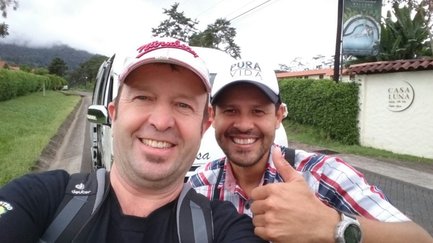 Rainer Stoll, Gründer des Reiseveranstalters For Family Reisen, reist fast jedes Jahr in seine zweite Heimat Costa Rica. Er besucht die Unterkünfte, testet neue Programme für Familien und trifft unsere Partner und Reiseleiter, z. B. Jonathan, der hier auf dem Bild mit Rainer zu sehen ist. Vom umweltfreundlichen Hotel Casa Luna, in dem auch unsere Gäste auf den Costa Rica Familienreisen umgeben von tropischen Gärten mit Blick auf den Vulkan Arenal und den Regenwald übernachten, machen sich die beiden auf, noch tiefer in den Regenwald zu fahren. Das Ziel: Die Eco-Lodge La Tigra.