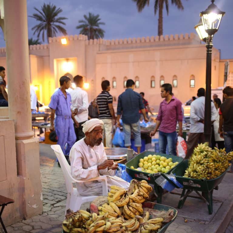 Mit Hilal, unserem Reiseleiter, besuchen wir die Oase Birkat al Mouz und lernen einen Dattelbauer kennen. Wir erfahren, dass dessen Sohn nicht mehr selbst Dattelbauer werden will und die Palmen dann nur noch von Arbeitern bewirtschaftet werden. Wir haben Glück und können den Arbeitern auch direkt zusehen, wie sie die Palmen barfuß erklimmen und die in Oman so beliebten Früchte ernten. Gar nicht so leicht, auf die hohen Palmen zu klettern – wer sich traut, kann es natürlich auch gleich selbst testen!