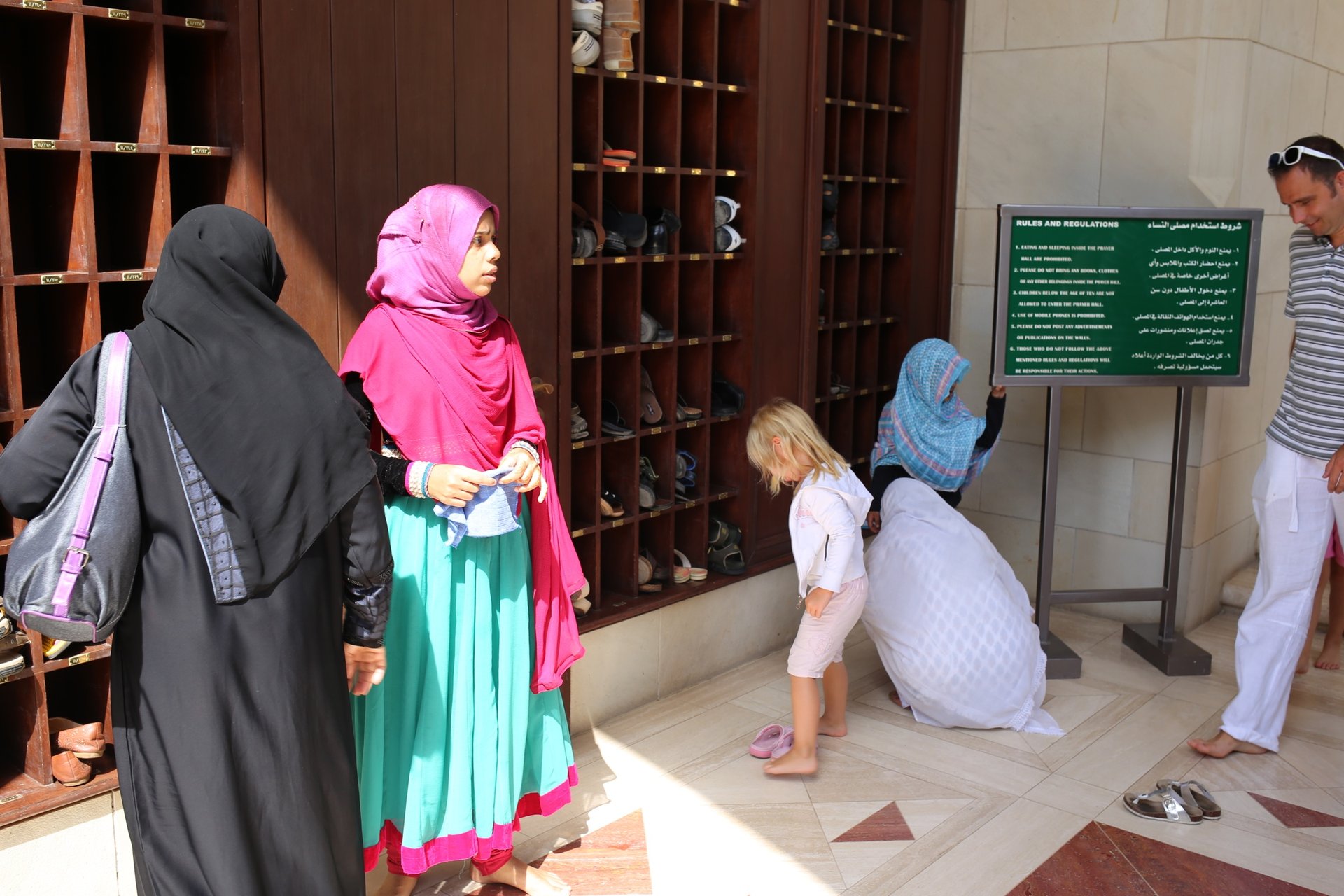 Der Besuch der Sultan Qaboos Grand Mosque hat uns tatsächlich nachhaltig beeindruckt – der Prachtbau ist überwältigend und angenehm kühl. Überall treffen wir westliche Familien, die die Moschee genauso wie wir besuchen. Auch alle Kinder dürfen die Räume der Moschee betreten, Frauen natürlich mit Kopftuch und die Schuhe werden in Regalen davor abgestellt. Das Gelände rund um die Moschee umfasst eine Fläche von 416.000 Quadratmetern. Die große Gebetshalle bietet 6.600 Gläubigen Platz. Sie ist mit einem edlen persischen Teppich ausgelegt. In der Mitte der hohen Kuppel hängt ein riesiger Kronleuchter aus Swarovski-Kristall, dessen Lampen die Kuppel in ein wunderschönes Licht tauchen.