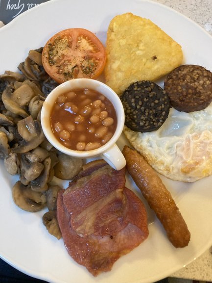 Ein Irish Breakfast ist ein herzhafter und üppiger Frühstücksklassiker, der in Irland nicht nur als Start in den Tag, sondern auch als echtes Kulturgut gilt. Auf dem Teller landen typischerweise gebratener Speck (Rashers), Würstchen (Sausages), Spiegeleier oder Rührei, gebratene Tomaten, Champignons, Baked Beans und Toast oder Sodabrot. Besonders charakteristisch sind auch Black Pudding und White Pudding, zwei regionale Blut- bzw. Fleischwürste, die oft dazu serviert werden. Dazu gibt es meist eine kräftige Tasse Tee oder Kaffee.