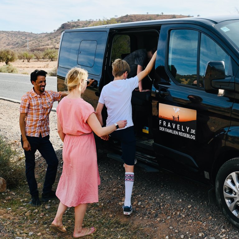 Melanie: „Also Ben ist zehn, er ist das Reisen und weitere Fahrtstrecken auch gewohnt. Wenn man Kinder hat, die gerne Autofahren, dann ist die Reise auch für jüngere Kinder easy. Viel Belastung, im Sinne von weiten Strecken, die zu Fuß zurückgelegt werden müssen, gibt es nicht. Man fährt fast überall mit dem Auto hin und läuft vielleicht mal eine halbe Stunde ein bisschen rum, zum Beispiel auch mit den Eseln oder Dromedaren, das ist auch für kleinere Kinder gut machbar. Also ich denke ab acht Jahren sicherlich auch. Die Kinder müssen es nur aushalten können, vier Stunden auch mal im Auto zu sitzen.“