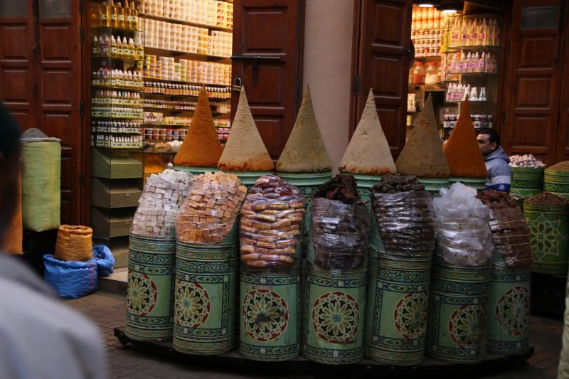 Wir betreten einen kleinen Souk in einer verborgenen Seitengasse, in dem sonst nur Einheimische einkaufen. Unser Reiseleiter kauft frische Mandarinen und Oliven zum Probieren. Wir kosten und sind begeistert – alles schmeckt viel intensiver als Zuhause. Ich möchte gern das berühmte Argan-Öl kaufen – auch hier führt uns unser Reiseleiter wieder zu einer kleinen besonderen Kräuterapotheke abseits der Touristenviertel. Hier bekomme ich eine intensive persönliche Beratung, wir trinken Tee und die Kinder ruhen sich auf den Bänken aus und dürfen an den Gewürzen und Ölen riechen.