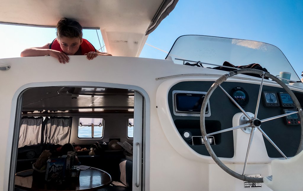 Ich vergleiche das Segeln mittlerweile gerne als Camping auf dem Wasser. Sehr viel mehr Platz als in einem großen Wohnmobil gibt es an Bord nämlich auch nicht. Auf unserem Schiff gibt es vier Doppelkabinen mit zugehörigen kleinen Bädern mit Toilette und ganz vorne im Bug noch zwei Einzelkabinen für den Skipper. Es ist alles klein, eng und im Sommer auch sehr heiß. Aber es ist ein tolles Piratenversteck und die Kids lieben es! Dementsprechend ist natürlich auch die Küche, die sogenannte Kombüse, recht übersichtlich. Es gibt einen kleinen Herd, eine Spüle und zwei größere Kühlschränke. Wir kaufen vorab für Frühstück und Mittagssnack sowie genügend Getränke ein, abends gehen wir eigentlich immer Essen. Insgesamt kochen wir zweimal einfache Gerichte wie Pasta oder Kartoffeln. An einem Abend bestellen wir Pizza und essen diese bei klarem Sternenhimmel auf dem Deck – Momente, die wir nicht mehr vergessen werden.