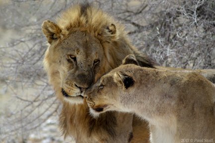 Ich bin ein großer Raubkatzenfan und da liegt es nahe, dass auf auf beiden Bildern Katzen sind. Mein Lieblingsfoto habe ich 2017 in Namibia gemacht, auf diesem Bild sind zwei Etosha-Löwen zu sehen, die sich im Gesicht beschnuppern.