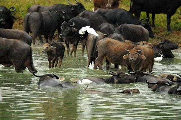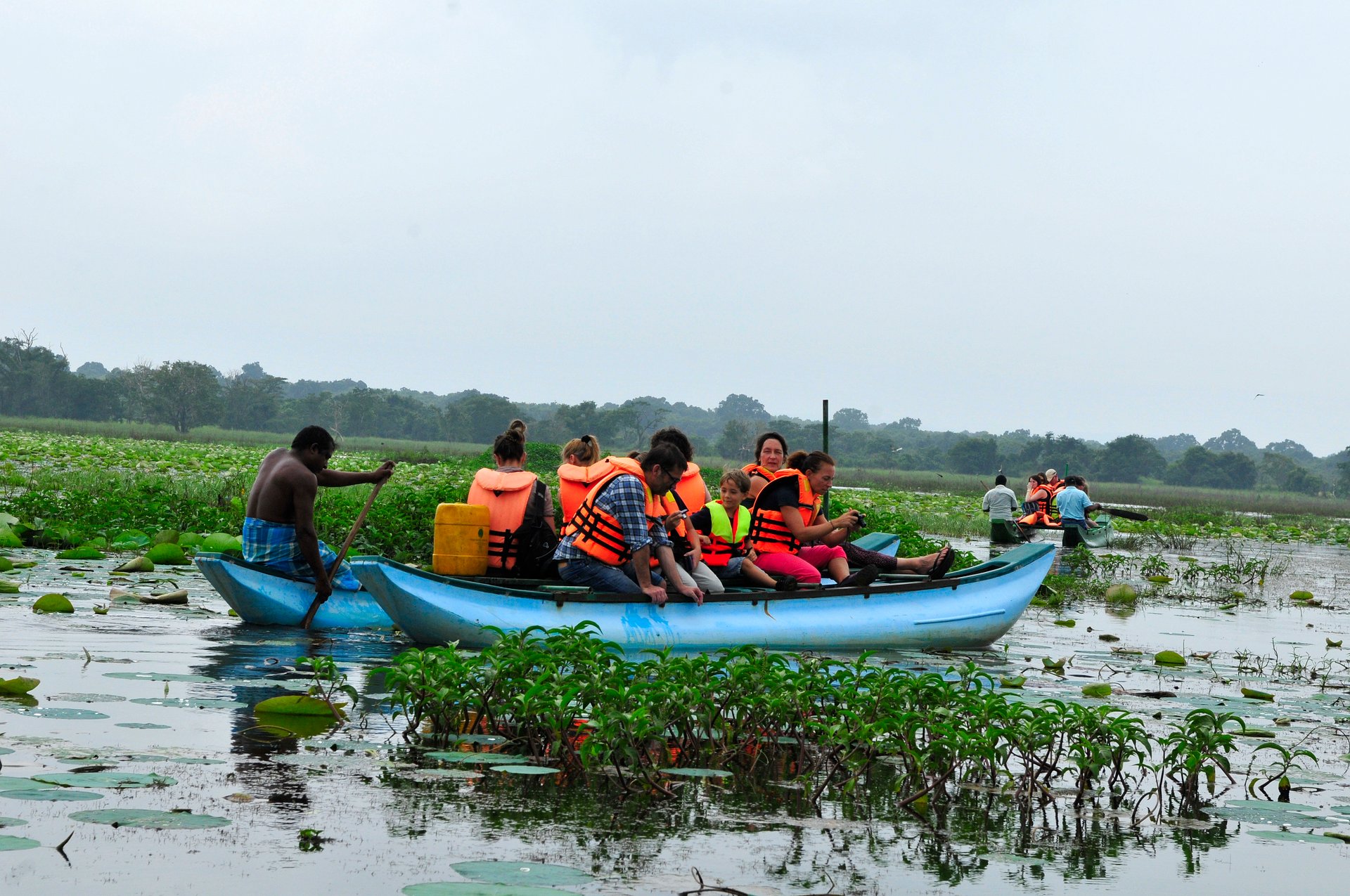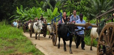 Bei einem Besuch des Dorfes Hiriwadunna wollen wir noch tiefer in die Kultur der Einheimischen eintauchen und mehr über deren Leben erfahren. Am Eingang des Dorfes warten schon drei Einwohner mit ihren Ochsenkarren auf uns. Sie bringen uns über eine Schotterpiste durch dichten Buschwald zum Fluss. Dort teilen wir uns auf mehrere Katamarane auf und fahren durch ein Meer von Seerosen hinüber auf die andere Seite des Indigo Reservoirs. Hier werden wir bereits von einem Bauern aus dem Dorf mit seiner Frau erwartet.