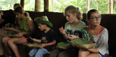Wir erfahren, dass die Flächen auf dieser Seite des Flusses der Landwirtschaft dienen und die Dorffamilien hier abwechselnd Nachtwache halten, damit die Wildelefanten nachts nicht ihre Ernte zerstören. Die Frau des Bauern zeigt uns außerdem auf eindrucksvolle Weise, wie sie Kokosnussraspeln herstellt und nachdem wir uns selbst daran probiert haben, heißt es Abschied nehmen, denn wir sind bei einer anderen einheimischen Familie aus dem Dorf zum traditionellen Mittagessen eingeladen.