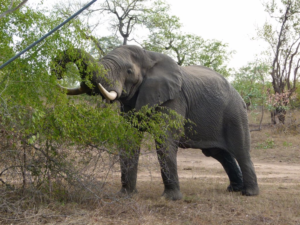 Am Nachmittag geht es auf meinen vorerst letzten Game Drive. Umkumbe ist ziemlich gut gebucht und so starten wir mit zwei offenen Jeeps. Wir haben gerade die Lodge verlassen, da stoßen wir schon auf den ersten Elefanten, der genüsslich die Äste vom Baum rupft. Liezel, unser Guide, erzählt uns, dass ein Elefant 200 bis 300 kg Grünzeug pro Tag frisst. Kein Wunder, schließlich ist er bis zu 20 Stunden am Tag mit der Nahrungsaufnahme beschäftigt.