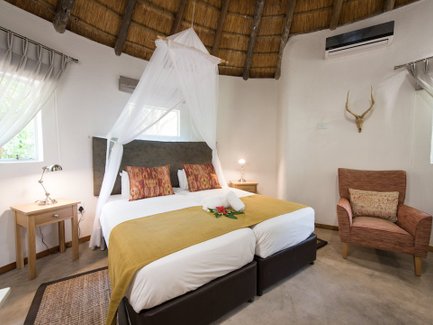 Als ich von der Sonnenterrasse aus noch einmal einen Blick in Richtung des Flusses werfe, entdecke ich eine kleine Büffelherde. Ein Ranger begleitet uns zurück in die Chalets. Zwar ist die Lodge mit einem Zaun abgetrennt, allerdings werden die Gäste, um wirklich auf Nummer sicher zu gehen, nach Einbruch der Dunkelheit zu ihren Chalets begleitet. Als ich mein Zimmer betrete, brennt bereits ein gemütliches Licht und mein Bett ist schon von einem Moskitonetz umgeben. Das Personal hat bereits alles für die Nachtruhe vorbereitet. Auf dem Boden steht eine Kerze mit ein paar Streichhölzern, schließlich befinden wir uns inmitten des afrikanischen Busches, da kann es schon mal zu Stromausfällen kommen.