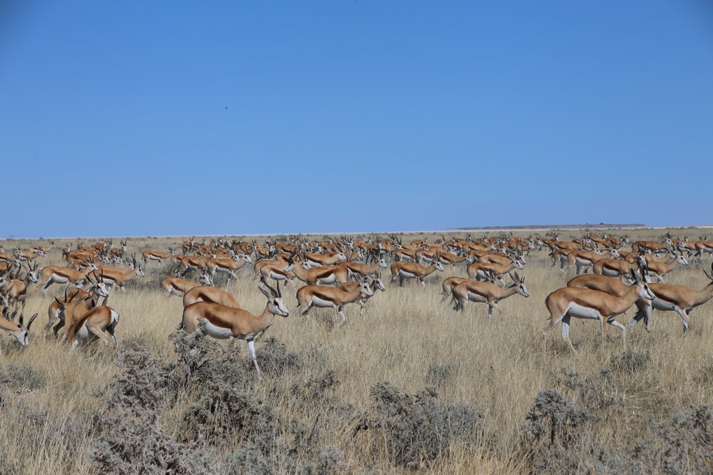 Der Etosha Nationalpark gehört zu den bekanntesten und den größten Schutzgebieten Afrikas und beeindruckt nicht nur durch seine Tierwelt, sondern auch durch seine einzigartige Landschaft, die mit offenen Grasflächen und Mopane-Wäldern Lebensraum für zahlreiche Tierarten bildet. Große Teile des Parks werden von der Etosha-Pfanne geprägt, einer riesigen Salzpfanne, die aus der Luft wie eine helle, fast schimmernde Fläche wirkt. Fun Fact: Die Salzpfanne ist sogar aus dem Weltall sichtbar! In der Regenzeit sammeln sich hier Wasserflächen, die zahlreiche Vögel anziehen, während sich in der Trockenzeit viele Tiere an den Wasserstellen versammeln.
