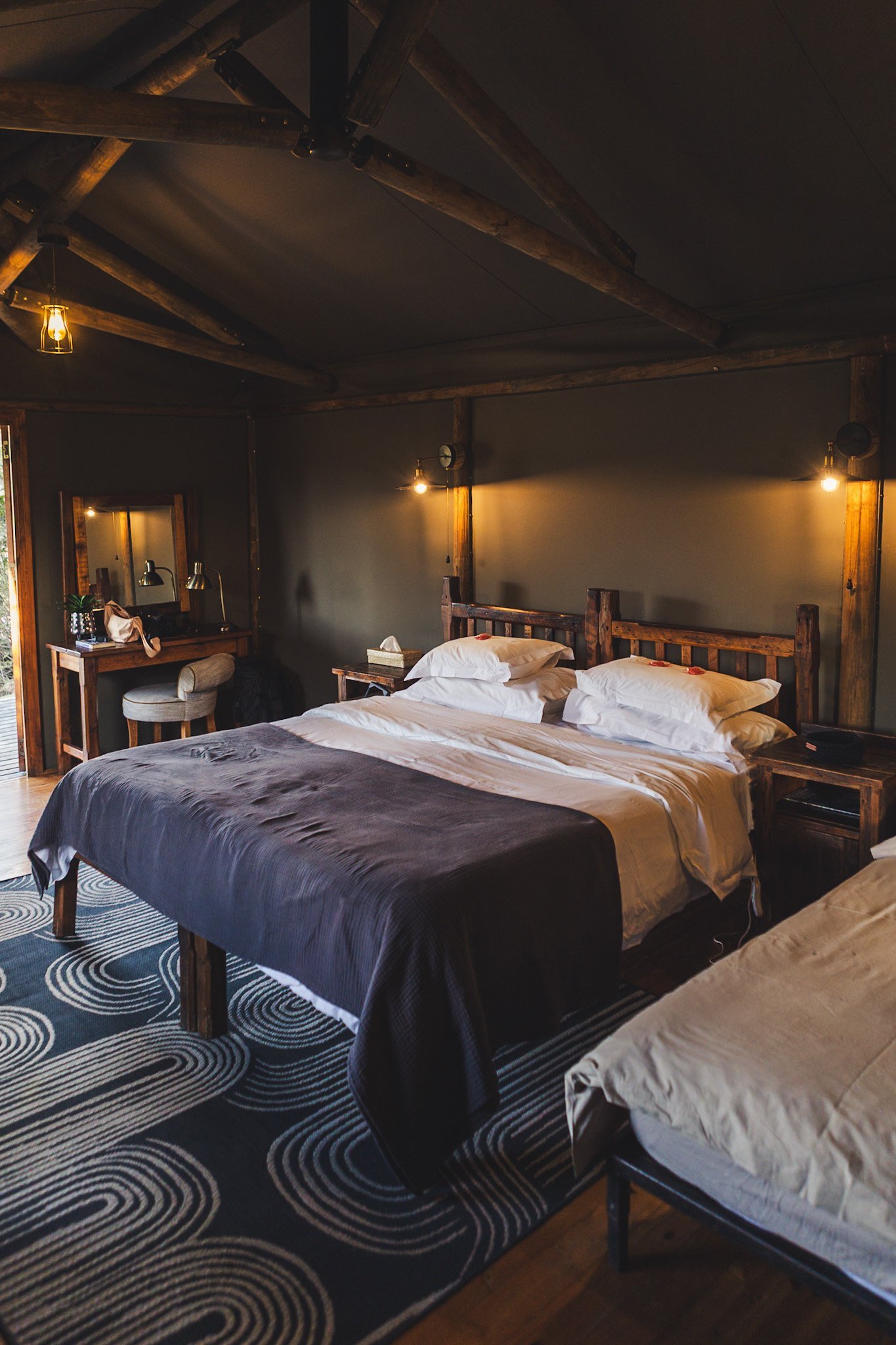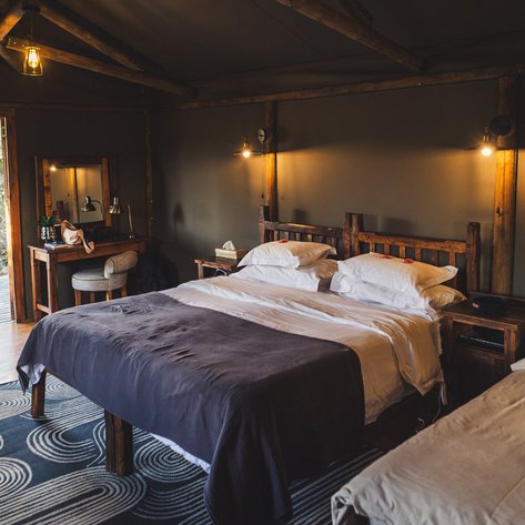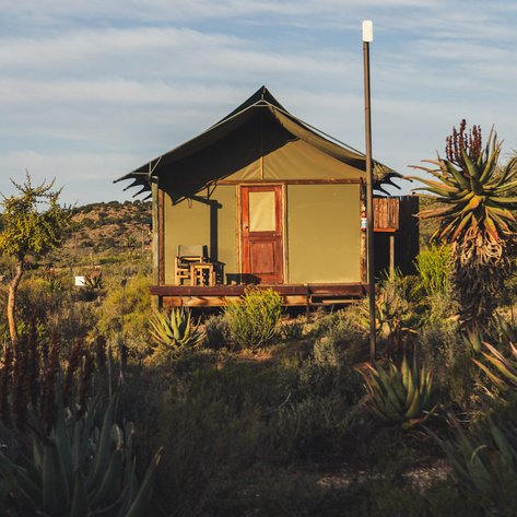 Die Zelte der Lodge sind klimatisiert und sind mit eigenem Bad und Minibar ausgestattet. Von einigen Zelten aus, hat von der Terrasse aus einen direkten Blick auf das Wasserloch. Das eigene Restaurant serviert à la carte Gerichte und preisgekrönte Weine der Region. In allen öffentlichen Bereichen ist freier WLAN Empfang.