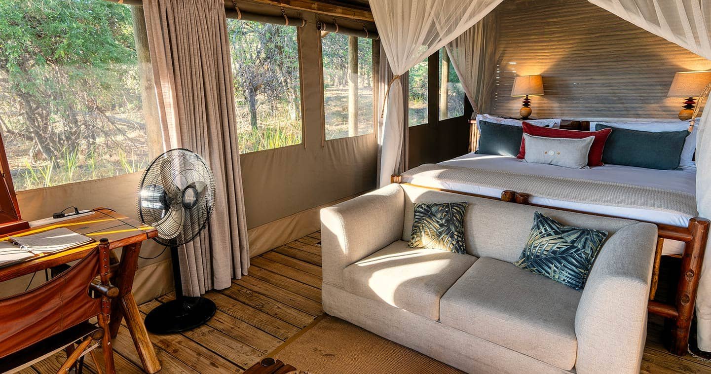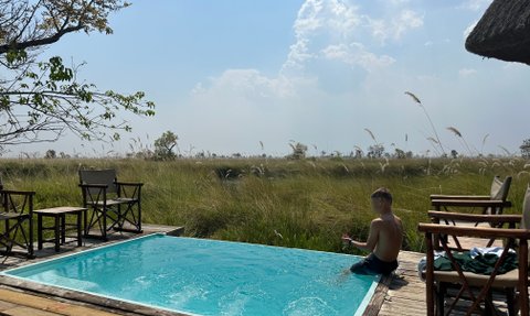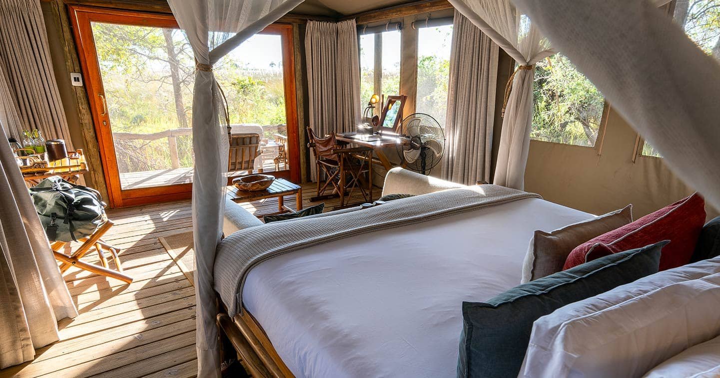 Die stilvollen Hauptgebäude erstrecken sich über den Fluss Khwai und wurden auf erhöhten Plattformen errichtet, um euch eine eindrucksvolle Aussicht auf die umliegenden Lagunen und Inseln zu ermöglichen. In den eleganten Wohn- und Speisesälen, die aus einheimischem Holz, Schilfholz und Stroh gebaut sind, findet ihr eine kleine Bibliothek, eine großzügige Sonnenterrasse, ein Tauchbecken und eine Sala mit Tagesbett.
