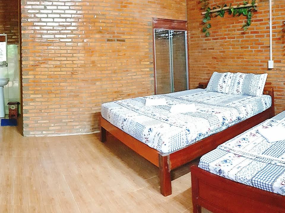 Die Zimmer sind einfach eingerichtet und verfügen über ein eigenes Bad, zudem wird das Bett von einem Moskitonetz umgeben. Auf dem Farmstay herrscht eine familiäre Atmosphäre und die freundliche Lodgebesitzerin heißt uns herzlich willkommen. Morgens wird ein asiatisches und ein vegetarisches Frühstück serviert.
