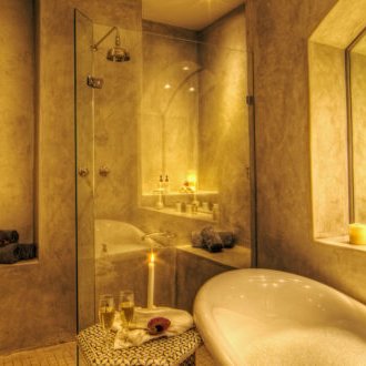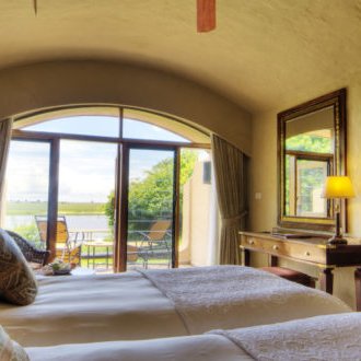 Jede der vier luxuriösen Suiten der Chobe Game Lodge bietet euch einen individuellen Tauchpool auf einer privaten Terrasse mit atemberaubendem Panoramablick über die weite Landschaft und die offene Ebene. Auch hier sorgen die hohen Bögen, steinbruchgefliesten Böden und Tonnengewölbe für eine Atmosphäre kühler Ruhe. Die insgesamt 46 Zimmer sind geschmackvoll eingerichtet – jedes mit handgefertigten Möbeln aus rhodesischem Teakholz und Wänden, die mit originalen afrikanischen Schnitzereien und Gemälden geschmückt sind.