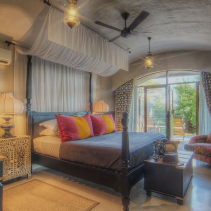 Mitten in der Wildnis erwarten euch ruhige, klimatisierte Unterkünfte mit eigenem Bad. Anmutige hohe Bögen, steinbruchgeflieste Böden und Tonnengewölbe schaffen dabei eine Atmosphäre kühler Ruhe.