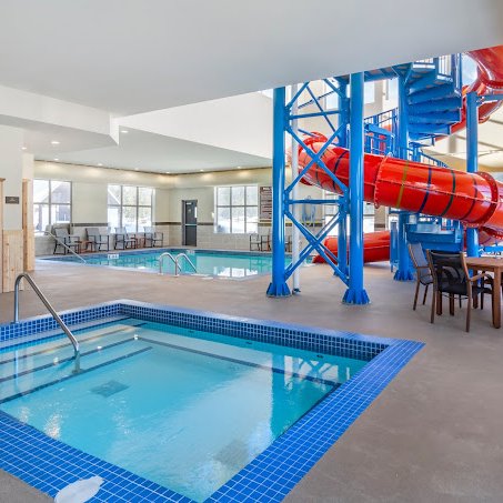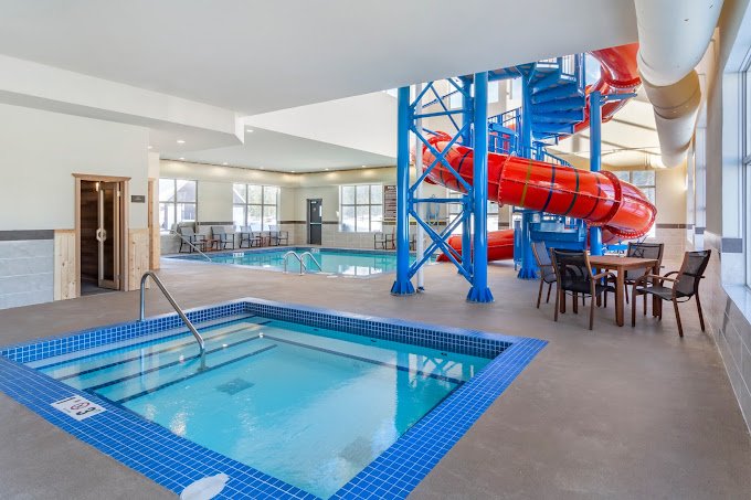 Das Hotel verfügt über einen Innenpool mit einer Wasserrutsche, was besonders die kleinen Gäste freut. Ein gut ausgestattetes Fitnesscenter steht zur Verfügung. Die gemütliche Lobby mit einem einladenden Kamin ist der perfekte Ort, um sich zu entspannen.