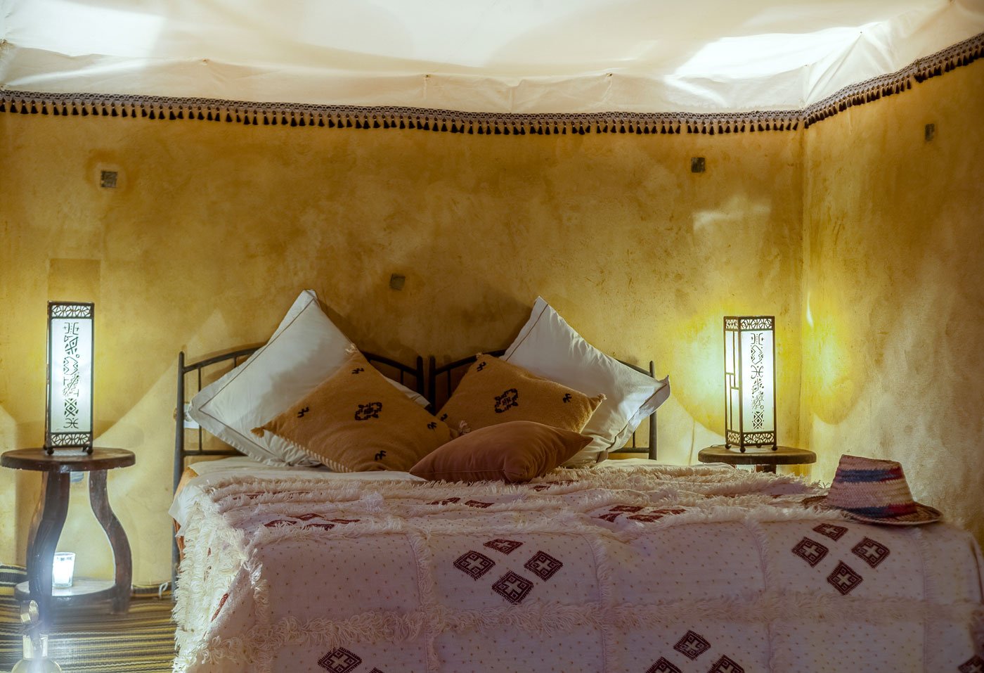 Die Zelte des Camps sind gemütlich mit bunten Teppichen und komfortablen Betten eingerichtet. Zusätzlich verfügt jedes Zelt über eine Sitzecke sowie ein eigenes Bad mit Warmwasser-Dusche.