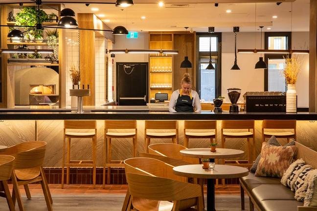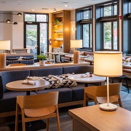 Die Lobby lädt mit Kamin, Sitzgelegenheiten und skandinavischem Flair zum Verweilen ein, während das hoteleigene Restaurant "Farm & Fire" regionale Küche mit Fokus auf frischen Zutaten aus der Umgebung serviert.