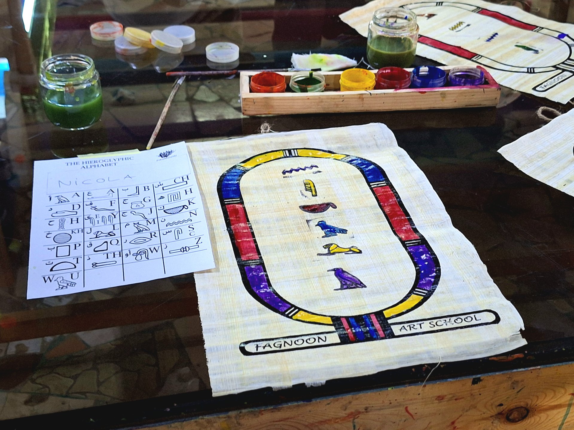 Zum Mittag steht der Besuch des Fagnoon Art Center auf dem Programm. Dort gibt es für uns ein leckeres BBQ ägyptischer Art. Wir verbringen ein paar entspannte Stunden auf dem Gelände, das der Künstler Mohamed Allam gegründet hat, um ägyptischen Kindern einen Ort des freien Denkens zu ermöglichen, ohne sie einzuschränken und um damit ihre Talente und Kreativität zu entdecken: Malen, Töpfern, auf Spielplätzen toben, Tiere streicheln … Hier gibt es wirklich viele Angebote! Auch wir können aktiv mitmachen und die Kinder dürfen eine eigene Arbeit aus Ton töpfern.