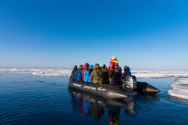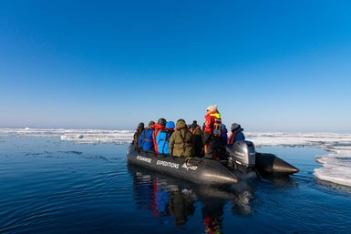 Zwischen den treibenden Eisschollen fühlen sich Bartrobben und Ringelrobben besonders wohl und auch Eisbären streifen hier auf der Suche nach Beute über das Eis. In kleinen Gruppen steigen wir in die Zodiacs und gleiten durch das kristallklare Wasser des Lomfjords. Plötzlich ragen sie vor uns auf, die beeindruckenden Vogelfelsen von Alkefjellet, wo Tausende Trottellummen dicht gedrängt nisten. Ein lebendiges Naturschauspiel, das Groß und Klein begeistert! Auf der Ostseite der Hinlopenstraße legen wir je nach Wetterlage in Palanderbukta an. Die weite Tundra dort ist ein Paradies für Rentiere, Blässgänse und mit etwas Glück auch für Walrosse. Wer Lust hat, erkundet die Gegend bei einer kleinen Wanderung und genießt die Stille der Arktis.