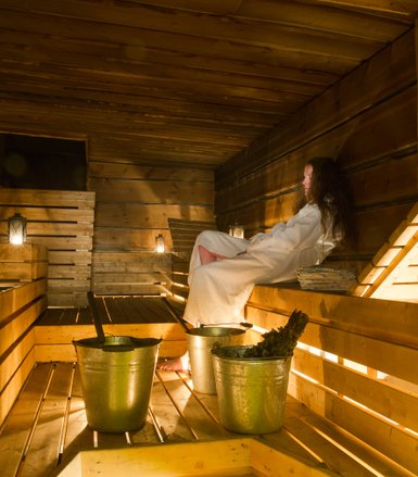 Drei verschiedene Saunen stehen zur Verfügung: eine traditionelle holzbeheizte Sauna, eine Rauchsauna und eine Dampfsauna. Wir nehmen noch ein erfrischendes Bad im Außenpool. Alle notwendigen Sauna-Utensilien, wie Handtücher und Togas, werden gestellt. Getränke wie Wasser sind inkludiert und es besteht auch die Möglichkeit, andere alkoholische und Soft-Getränke zu kaufen.