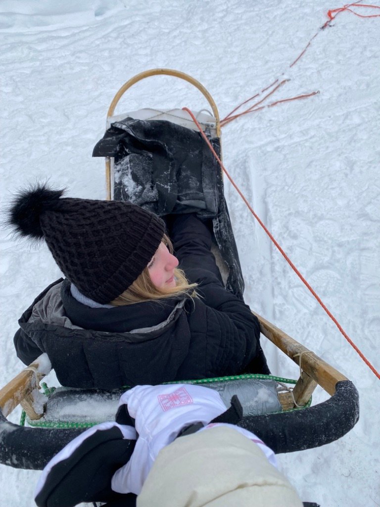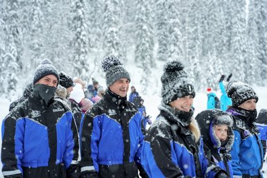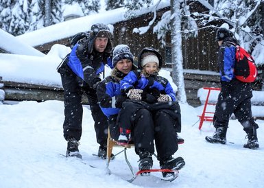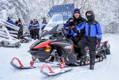 Die Safari erstreckt sich über 20 km, wobei die Route je nach den Kenntnissen der Gruppe variiert. Kinder dürfen entweder als Beifahrer auf dem Schneemobil Platz nehmen oder sich gemütlich im Schlitten zurücklehnen.