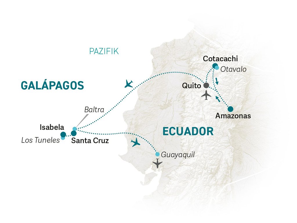 Die Reise ist bewusst als Kombination aus Galápagos und dem vielfältigen Festland Ecuadors konzipiert. Da es auf dem Festland außergewöhnlich viel zu entdecken gibt, liegt die Besonderheit dieser Reise auf einem ausgewogenen Gesamterlebnis. Neben den Galapagos-Inseln, La Isabela und Santa Cruz, können Sie auch die beeindruckenden Landschaften des Amazonas und den Ausflug an den Äquator erleben, so dass Sie einen umfassenden Eindruck von Natur, Kultur und Landschaften erhalten. Eine individuelle Verlängerungsmöglichkeit dieser Reise bietet Ihnen die Möglichkeit weitere Inseln zu besuchen und noch tiefer in diese tolle Landschaft einzutauchen.