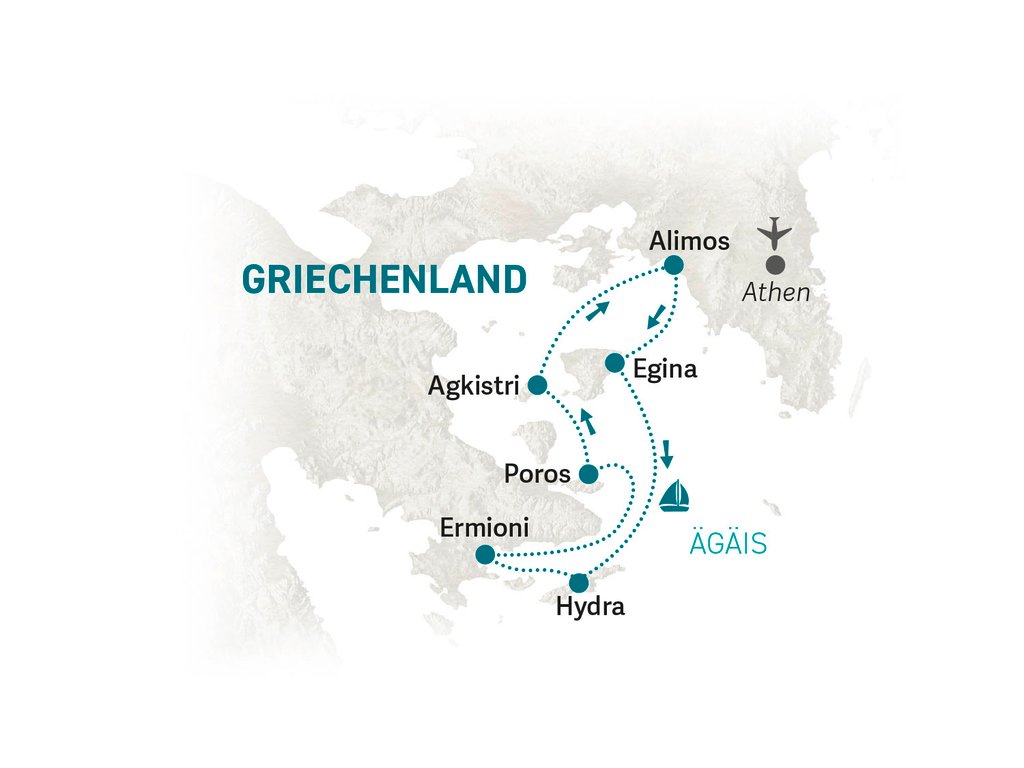 Die Länge der Tagesetappen und Anzahl der Zwischenstopps wird je nach Gruppe und Wetterverhältnissen individuell angepasst. Spontan können wir eine schöne Bucht für einen erfrischenden Sprung ins Mittelmeer ausfindig machen oder eine abgelegene Insel auf eigene Faust erkunden. Aus diesem Grund lässt sich auch kein fester Reiseverlauf ausmachen, denn abhängig von den Windverhältnissen entscheiden wir jeden Tag aufs Neue, ob wir in einer malerischen Bucht oder einem verträumten Küstenstädtchen vor Anker gehen. Unsere Tour führt uns grob von Alimos in Richtung der Halbinsel Peloponnes, wo die vielen kleinen und großen vorgelagerten Inseln ein wunderschönes Revier zum Segeln bilden. Die Inseln Poros und Hydra sowie das Küstenstädtchen Ermioni stehen dabei garantiert auf unserer Segelroute.
