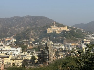 Nach dem Besuch in dem Künstlerdorf fahren wir weiter zum Galta Ji, einem Affentempel. Hierher kommen sowohl Einheimische als auch Touristen, um im Tempel zu beten, ein heiliges Bad zu nehmen und die Affen zu füttern, die erstaunlich zahm sind. Wir klettern bis zur Bergspitze hinauf und haben von hier oben – pünktlich zum Sonnenuntergang am Sonnentempel - den besten Blick auf die Stadt.