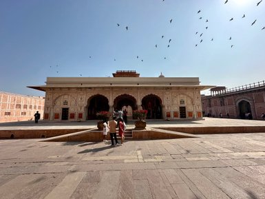 Anschließend setzen wir unsere Fahrt nach Jaipur fort. In Jaipur findet man noch zahlreiche Erbe an hoheitlicher Geschichte. Außerdem bildet Jaipur mit Delhi und Agra das weltberühmte „Goldene Dreieck“. Die berühmte Pink City von Rajasthan ist eine lebendige Kollage aus großen Palästen, Wüstenkultur und einer reichen Rajputana Geschichte. Nachdem wir in unser Hotel eingecheckt haben, begeben wir uns auf eine Sightseeingtour durch Jaipur. Unseren ersten Stopp legen wir am Stadtpalast ein. Hier können wir ein interessantes Gemisch aus traditioneller Rajput- und Mogul-Architektur bestaunen. Das weitläufige Areal des Palastes nimmt fast ein Siebtel der „Pink City“ ein und enthält unter anderem mehrere Museen. Anschließend gehen wir weiter zum Jantar Mantar, der größten von fünf astronomischen Sternwarten Nordindiens. Es zählt ebenfalls zum UNESCO-Weltkulturerbe und wurde 1734 fertiggestellt. Hier erfahren wir viel über die Messung der Zeit, die Voraussage von Eklipsen, den Verlauf der Planetenbahnen und vor allem wie die Wissenschaftler das in der damaligen Zeit so gut bestimmen konnten.