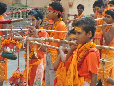 Nachdem wir in unser Hotel eingecheckt haben, unternehmen wir am Nachmittag einen Spaziergang durch Pushkar und können die heiligen Stätten des Hinduismus bestaunen. Die Stadt ist übersät mit Orten von großer religiöser und historischer Bedeutung. So befindet sich hier auch der weltweit einzige Tempel, der dem Gott Brahma gewidmet ist. Den Brahma-Tempel erkennt man an seiner goldenen Spitze und über dem Eingang ist das Symbol des Brahma, die Gans, zu sehen. Wir besuchen den Brahma-Tempel und merken schnell, dass der Gott Brahma eine immense Bedeutung im Hinduismus trägt. Vor dem Tempel finden wir viele Opfergaben, wie kunstvolle Blütengirlanden, Wasserkrüge, Räucherstäbchen und verschiedenfarbige Farbpulver zum Auftragen des hinduistischen Stirnzeichens.