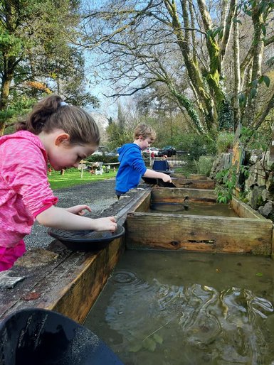 Nach der Mittagspause geht es unter Tage: Ausgerüstet mit Helm und Neugier erkunden wir die stillgelegte Mine. Wir erfahren auf kindgerechte Weise, wie hart das Leben der Bergleute früher war, besonders während der großen Hungersnot. Zum Abschluss können alle, die möchten, selbst ihr Glück versuchen und nach Gold schürfen