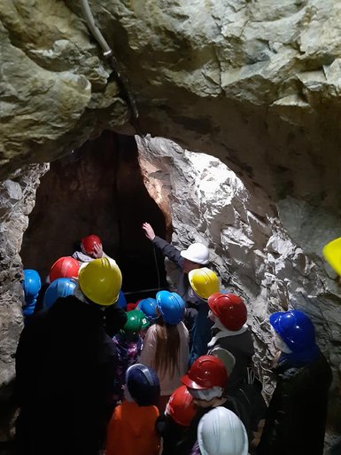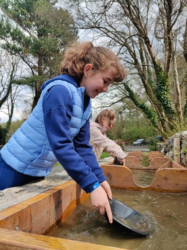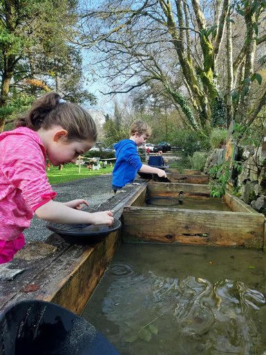 Anschließend geht es ausgerüstet mit Helm und Neugier in die stillgelegte Mine. Wir erfahren auf kindgerechte Weise, wie hart das Leben der Bergleute früher war, besonders während der großen Hungersnot. Zum Abschluss können alle, die möchten, selbst ihr Glück versuchen und nach Gold schürfen.