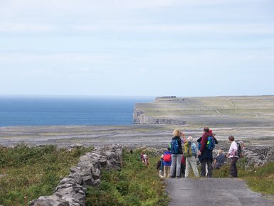 Nach dem Frühstück verlassen wir unsere Unterkunft in Lisdoonvarna und setzen mit der Fähre nach Inishmore über, die größte der drei vor der Galway-Bucht gelegenen Aran Islands. Die Inseln trotzen der Kraft des Atlantiks und sind für ihre antiken Stätten bekannt. Auf Inishmore lernen wir, weshalb die Aran Islands auch als „Inseln der schweigenden Steine“ bezeichnet werden. Hinter dem mythischen Namen verbergen sich nämlich Karrenfelder. Dies sind geologische Formationen, welche wir bei einer Inselwanderung unter die Lupe nehmen können.