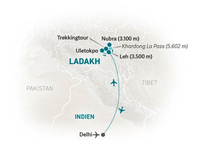 Nach erlebnisreichen Tagen in Delhi und Leh, die auch dem Akklimatisieren dienen, tauchen wir intensiv in die majestätische Berglandschaft ein. Die auf über 3.500 m liegende Hochgebirgswüste lädt zu unvergesslichen Wanderungen und einer spektakulären Fahrt über den höchsten befahrbaren Pass der Welt ins Nubra Tal ein. Dort bezaubert uns die fruchtbarste Region Ladakhs mit ihren reichhaltigen Obstplantagen. Während der anschließenden mehrtägigen Trekkingtour erleben wir einige der schönsten Dörfer Ladakhs, abgeschiedene Klöster, grandiose Ausblicke auf die Bergwelt und die einmalige Herzlichkeit der Ladakhis.