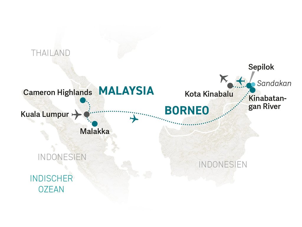 Nach dem Frühstück besuchen wir das Orang-Utan-Rehabilitationszentrum, welches zum Schutz der beeindruckenden Menschenaffen eingerichtet wurde. Borneo ist neben Sumatra der einzige Ort, an dem diese Tiere noch in ihrem natürlichen Lebensraum zu finden sind. In der sogenannten Nursery School haben wir die Möglichkeit, insbesondere jüngere Affen bei ihren Kletterversuchen zu beobachten. Sie werden hier langsam auf das Leben in der Wildnis vorbereitet, denn das Ziel der Organisation ist es, die Tiere wieder auszuwildern. Noch spannender wird es an der großen Feeding Plattform. Zwei Mal am Tag wird den Tieren hier Futter zur Verfügung gestellt, die Entscheidung ob sie das Angebot wahrnehmen wollen oder sich ihre Nahrung im Dschungel selbst suchen, bleibt dabei ganz den Tieren überlassen. Umso beeindruckender, wenn dann ein erstes Rascheln das Eintreffen eines "Waldmenschen“, so die malaiische Übersetzung des Wortes Orang-Utan, ankündigt. Tatsächlich ist die Sichtung von Orang-Utans hier fast garantiert!