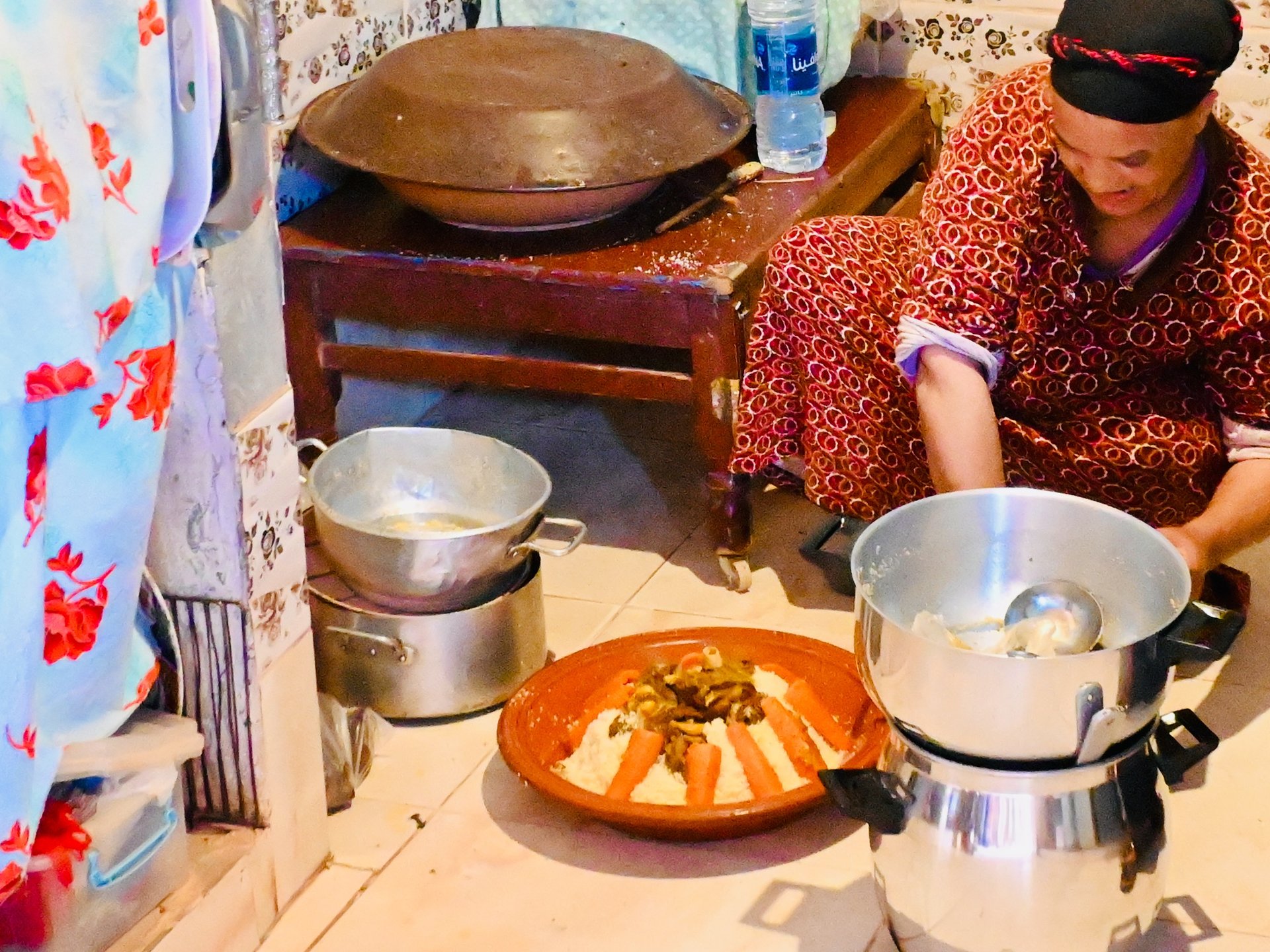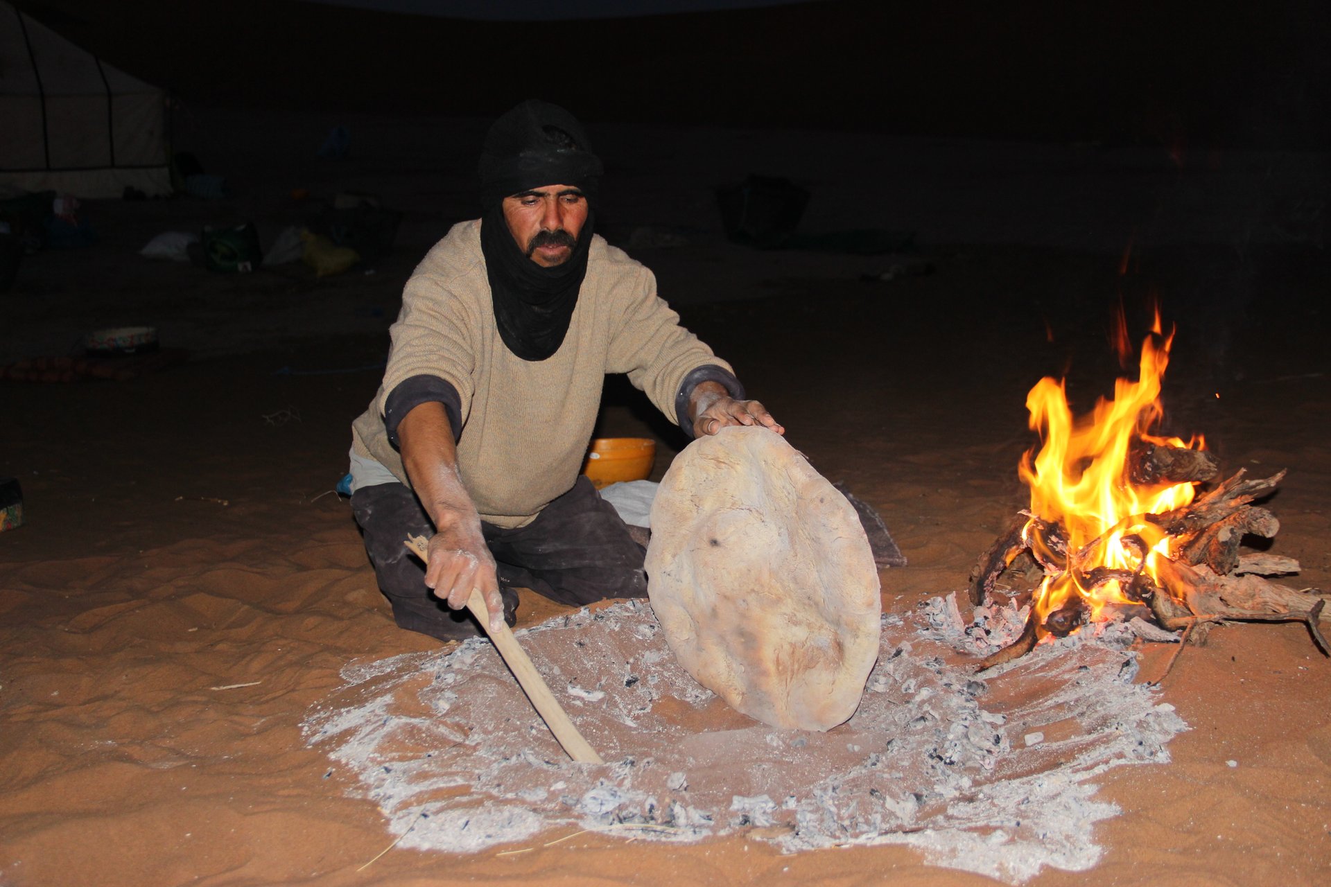 Nach der Durchquerung des Wadi Draas treffen wir zur Mittagszeit auf eine typische Nomadenfamilie und können erneut einen frischen Minztee zu unserem Mittagessen genießen. Bei der Familie lernen wir eine Menge über das Leben der Nomaden und wie sie sich an die für uns fremden Lebensumstände in der Wüste angepasst haben. Im Anschluss an dieses ursprüngliche Erlebnis wandern wir zurück zu unserem kleinen Camp und haben bis zum Abendessen Freizeit und können den Ausblick auf das glänzende Wüstenmeer zum Sonnenuntergang von den Dünen aus genießen.