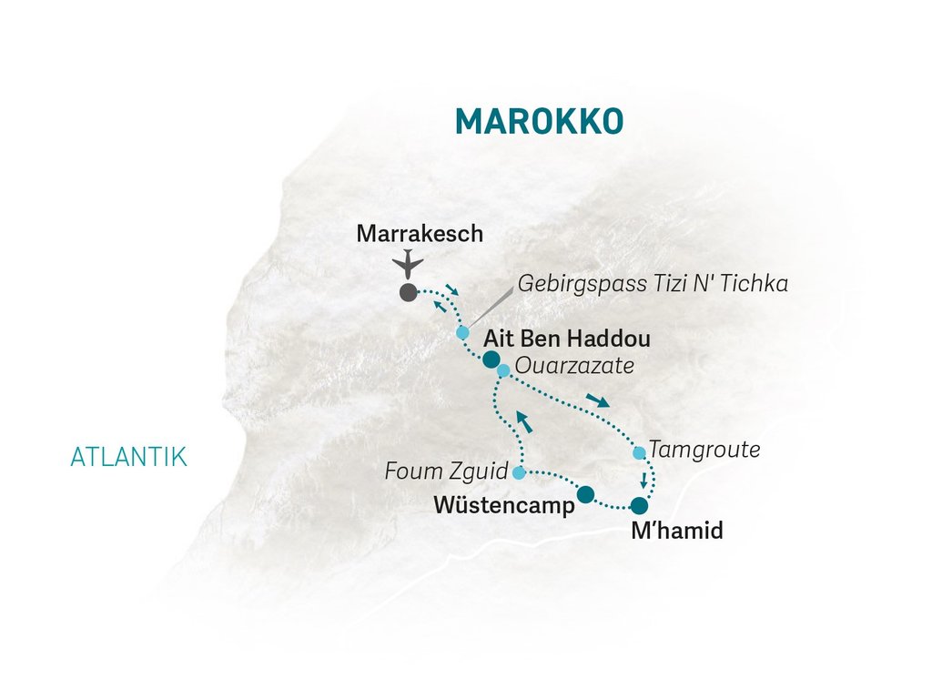 Die Reise führt uns durch die faszinierende Bergwelt des Hohen Atlas über den Tizi n’ Tichka-Pass bis zu den historischen Lehmdörfern und Kasbahs von Aït Ben Haddou. Unterwegs erleben wir die Gastfreundschaft der Berber, probieren traditionelle Gerichte und unternehmen ein Esel-Trekking durch das Tal. Im Draa-Tal bewundern wir Palmenhaine, Kasbahs und lebendige Dörfer, bevor wir weiter in die Sahara fahren.