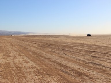Wir lassen die Atmosphäre der Wüste noch ein letztes Mal auf uns wirken, bevor es mit dem Jeep weitergeht: Es heißt wieder „Festhalten!“, wenn wir auf den alten Streckenabschnitt der Rallye Paris-Dakar einbiegen und schlingernd durch die Dünen brausen. Heute liegt ein langer Fahrtweg vor uns.