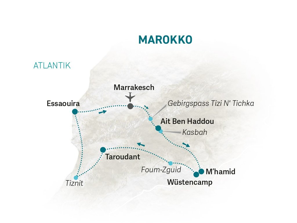 Auf dieser Familienreise entdecken wir das nordafrikanische Land Marokko in seiner ganzen Vielfalt! Wir atmen bei einer Kutschfahrt durch die Medina die Düfte der Königsstadt Marrakesch ein und erleben das allabendliche Spektakel auf dem zentralen Marktplatz. In den Hollywood-Filmstudios besuchen wir die Schauplätze zu Gladiator, Alexander, Die Mumie oder Lawrence von Arabien. Wir erkunden die faszinierende Bergwelt des Atlas-Gebirges, machen Halt an mächtigen Kasbahfestungen, lernen die Kultur der Berber kennen und spazieren durch fruchtbare Oasen. Am Ende der Reise stehen ein paar erholsame Strandtage am Atlantik in Essaouira auf dem Programm.