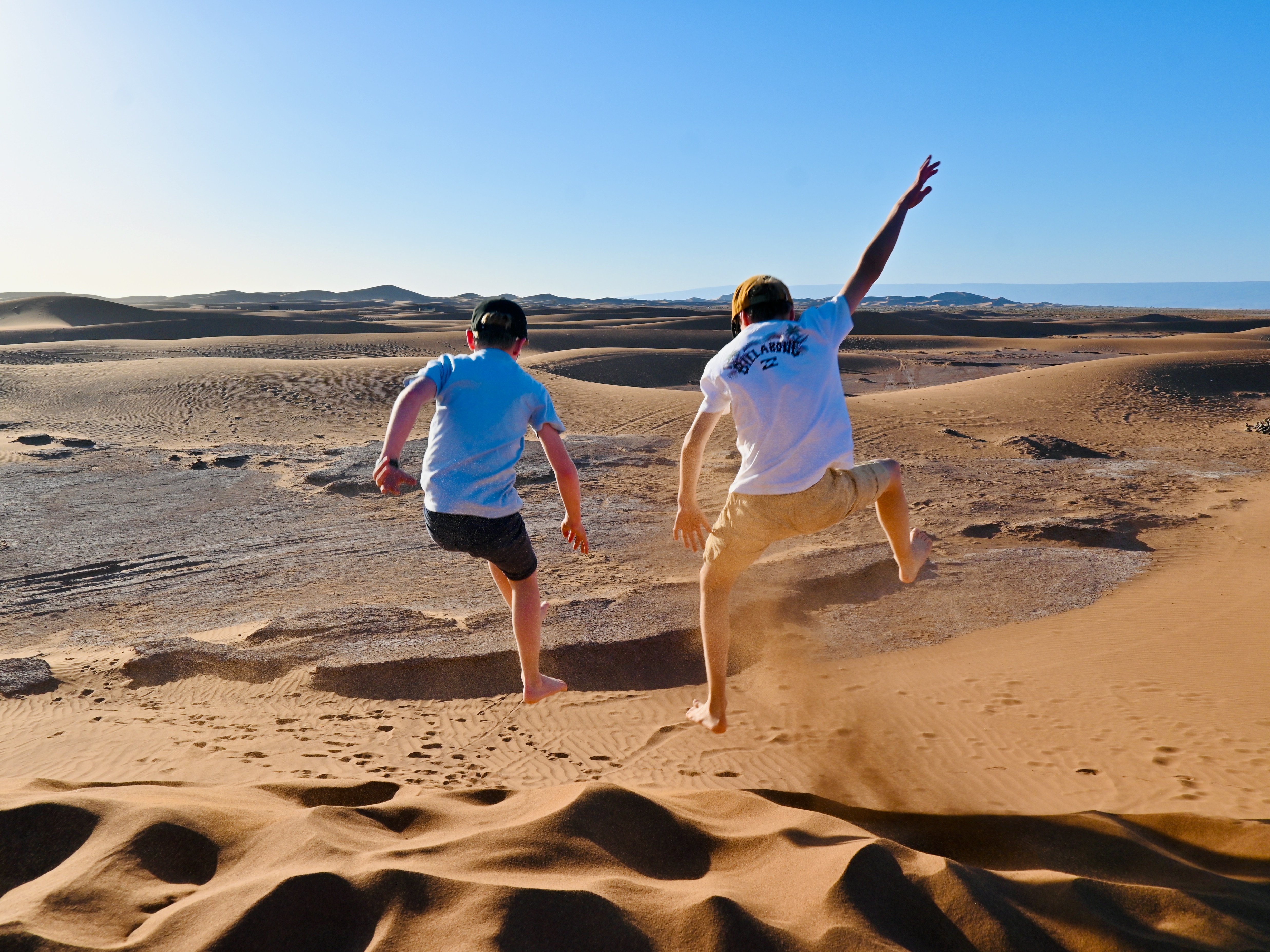 Der Nachmittag steht uns zur freien Verfügung. Wir können die höchsten Dünen erklimmen, das magische Panorama genießen und dort auf unseren letzten Sonnenuntergang in der Wüste warten. Das Camp bietet eine Vielzahl an Aktivitäten: Kameltrekkings, Sandboarding, Spaziergänge bei Sonnenuntergang entlang der Dünen sowie 4×4-Ausflüge in die abgelegenen Bereiche des Ergs. Doch vor allem sind es die tiefe Ruhe, die herzliche Gastfreundschaft und die überwältigende Landschaft, die einen bleibenden Eindruck hinterlassen.