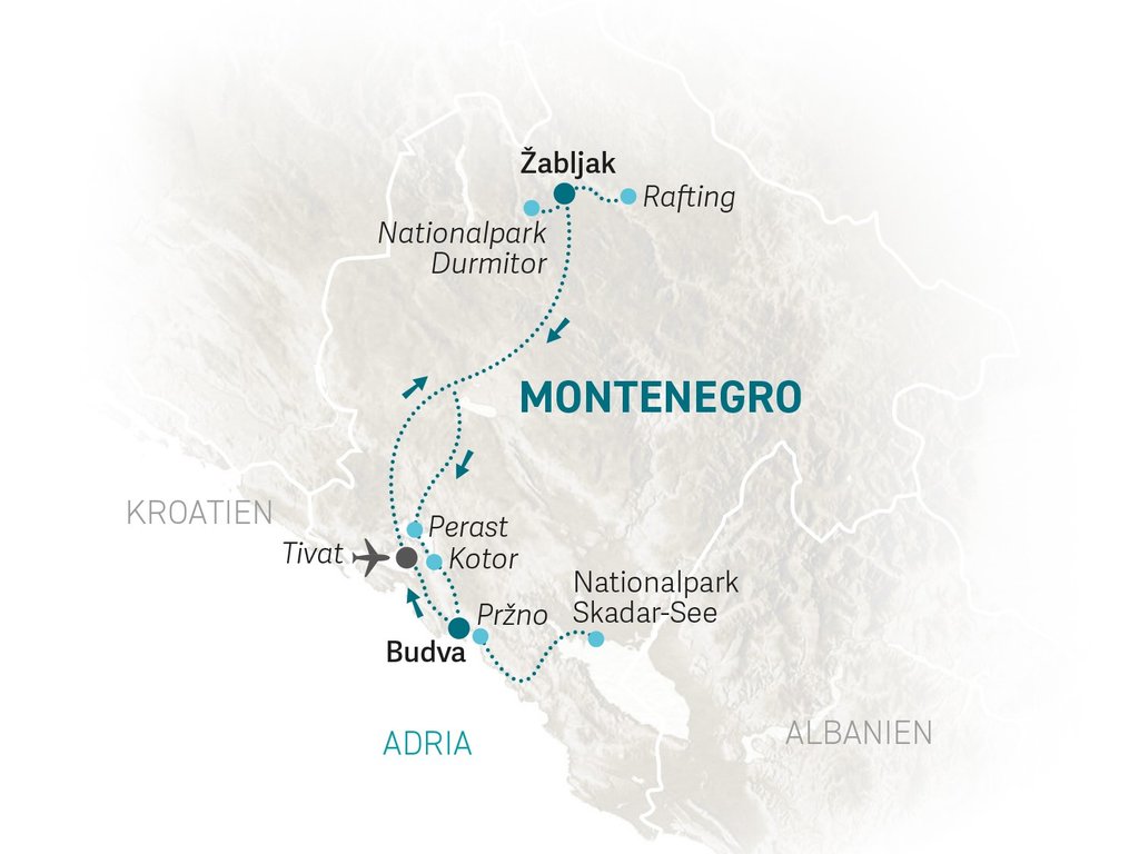 Wir übernachten zuerst 3 Nächte in dem kleinen Bergdorf Žabljak im Zentrum des Durmitor Nationalparks. In diesem spektakulären Gebirge erwarten uns spannende Outdoor-Aktivitäten wie Rafting, Wanderungen und ein Ausritt. Die gigantischen Ausblicke vom Sedlo-Pass (1.907 m hoch) und den schwarzen Gletschersee mit traumhaftem Bergpanorama sollten wir auf keinen Fall verpassen! Optional empfehlen wir auch eine aufregende Ziplining-Tour, die vor Ort gebucht werden kann. Nach den Tagen in den Bergen fahren wir über Kotor (UNESCO-Weltkulturerbe) in die geschichtsträchtige Stadt Budva und verbringen viel Zeit an den schönsten Stränden der Adria. Auf dem Programm stehen auch der Skadar-See-Nationalpark, die malerischen Fischerdörfer Pržno und Miločer sowie das Wahrzeichen Montenegros, die Insel Sveti Stefan.