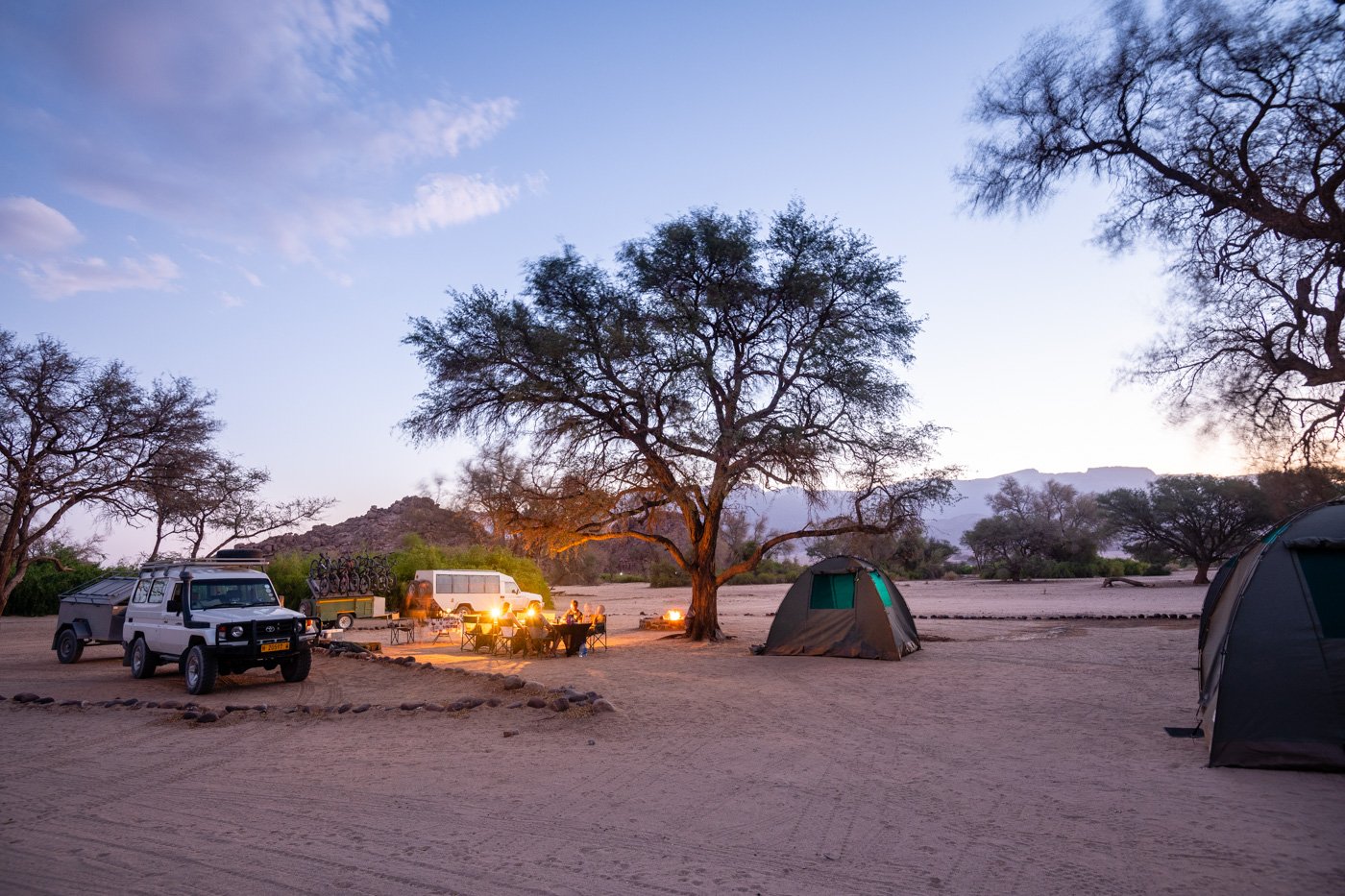 Mit vielen unvergesslichen Erlebnissen sitzen wir abends in unserem Camp am Lagerfeuer unter dem fantastischen Sternenhimmel und genießen diesen einzigartigen Moment, wenn man merkt: Wir sind wirklich hier – mitten im Abenteuer in der Wildnis Namibias!