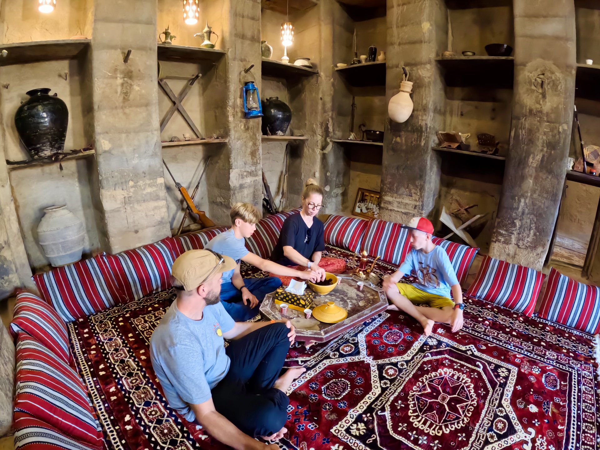 In der alten Lehmsiedlung besuchen wir das liebevoll eingerichtete Bait al-Safah Museum, ein lebendiges Kulturmuseum. Hier bekommen wir einen Einblick in das traditionelle Leben der Omanis. Hier wird uns gezeigt, wie man sich traditionell kleidet, Brot backt, Öl gewinnt, Kaffee röstet und Naturheilmittel aus Sandelholz herstellt. Natürlich probieren wir auch die süßen, frischen Datteln und den aromatischen omanischen Kaffee Kawa.