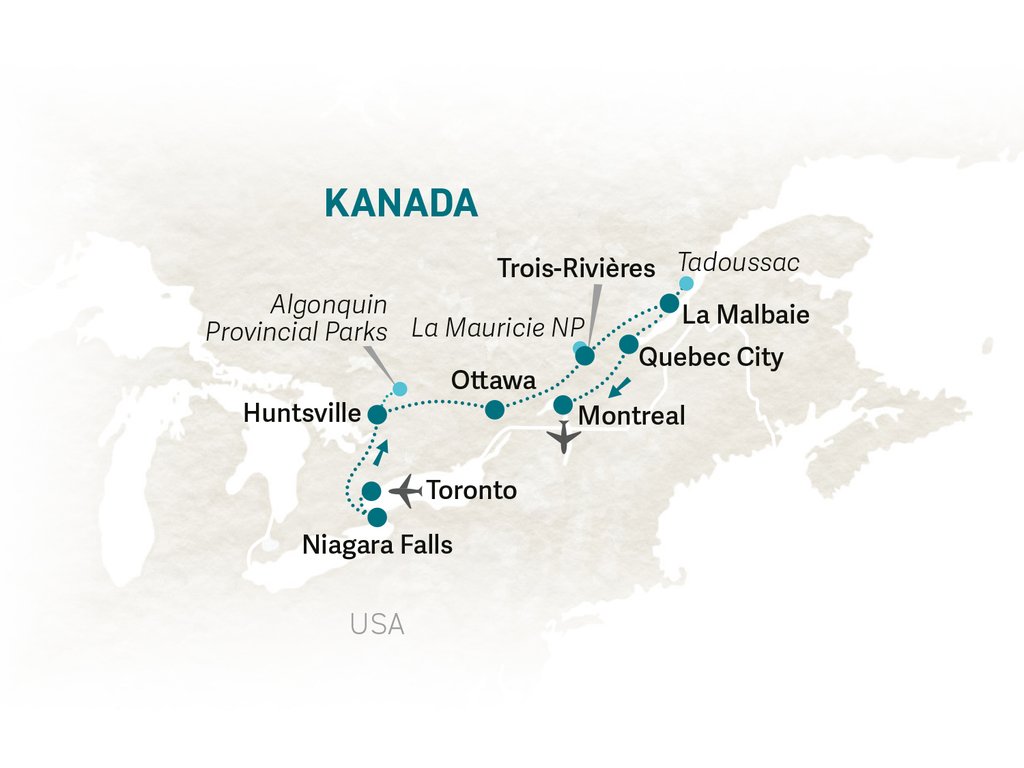 Begleiten Sie uns auf ein unvergessliches Abenteuer durch die schönsten Regionen Ostkanadas – perfekt für Familien, die Städte und Nationalparks aktiv erkunden möchten. Gemeinsam mit unserem erfahrenen, deutschsprachigen Guide führt die abwechslungsreiche Route von der Weltmetropole Toronto, zu den tosenden Niagarafällen in die unberührte Natur zur Tierbeobachtung in den Algonquin Provincial Park bis hin zu Kanadas Hauptstadt Ottawa. In der Provinz Quebec erwarten Sie dann neben Wanderungen im Nationalpark mit Wasserfällen und erfrischenden Seen, weitere charmante Städte mit französisch-kanadischer Lebensart und die Einkehr in eine traditionelle Zuckerhütte sowie optional der Besuch der indigenen First Nations.