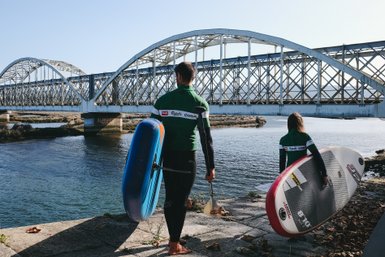 Auf der Flussinsel angekommen, erhalten wir eine kurze Einweisung, wie wir uns sicher auf unseren Longboards halten. Danach folgen wir dem rauschenden Fluss stromabwärts und erhalten bald einen einmaligen Panoramablick auf Viana do Castello. Sanft gleiten wir weiter über den Fluss und kommen dann an einer Austern-Aufzuchtstation vorbei und fahren unter der historischen Eiffel Brücke hindurch, welche im Jahr 1878 in Betrieb genommen wurde.