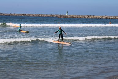 Und genau das steht heute an: Unser erster Surf-Kurs in Portugal! Direkt am Strand, unweit unseres Hotels, beginnt unsere Surf-Lektion auf den Wellen des Atlantischen Ozeans. Dabei steht uns der Guide mit Rat und Tat zur Seite und zeigen den Surf-Anfängern unter uns die Grundlagen des Wellenreitens. Zuerst geht es in den Neoprenanzug und wir tragen das Surfbrett ans Wasser. Nach ein paar Aufwärmübungen geht es bereits schnell ins Meer und wir versuchen die ersten Wellen zu reiten. Wer bereits ein Surfprofi ist, kann hier sein Können verbessern und bekommt bestimmt auch ein paar Tricks von den lokalen Guides gezeigt.