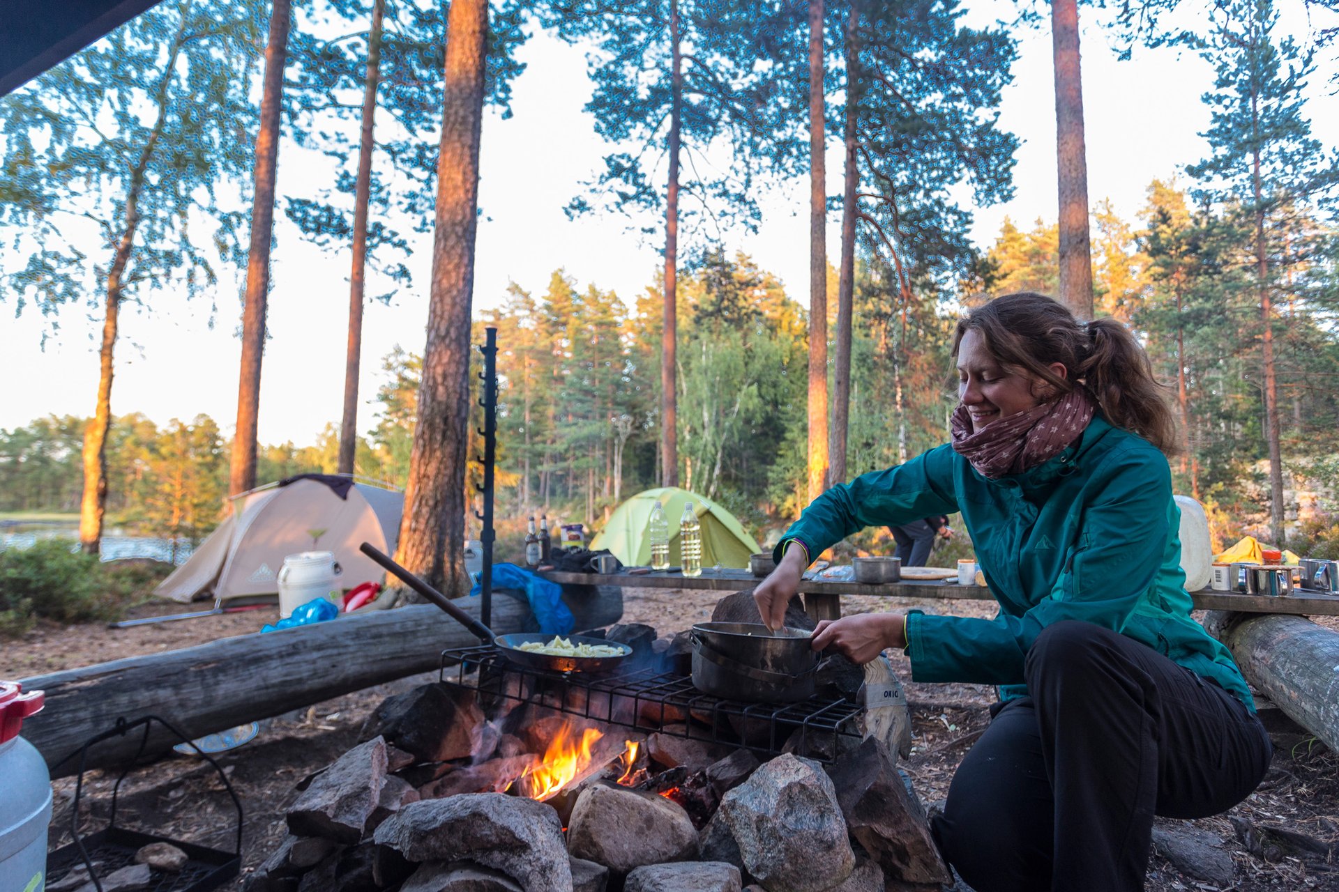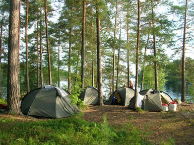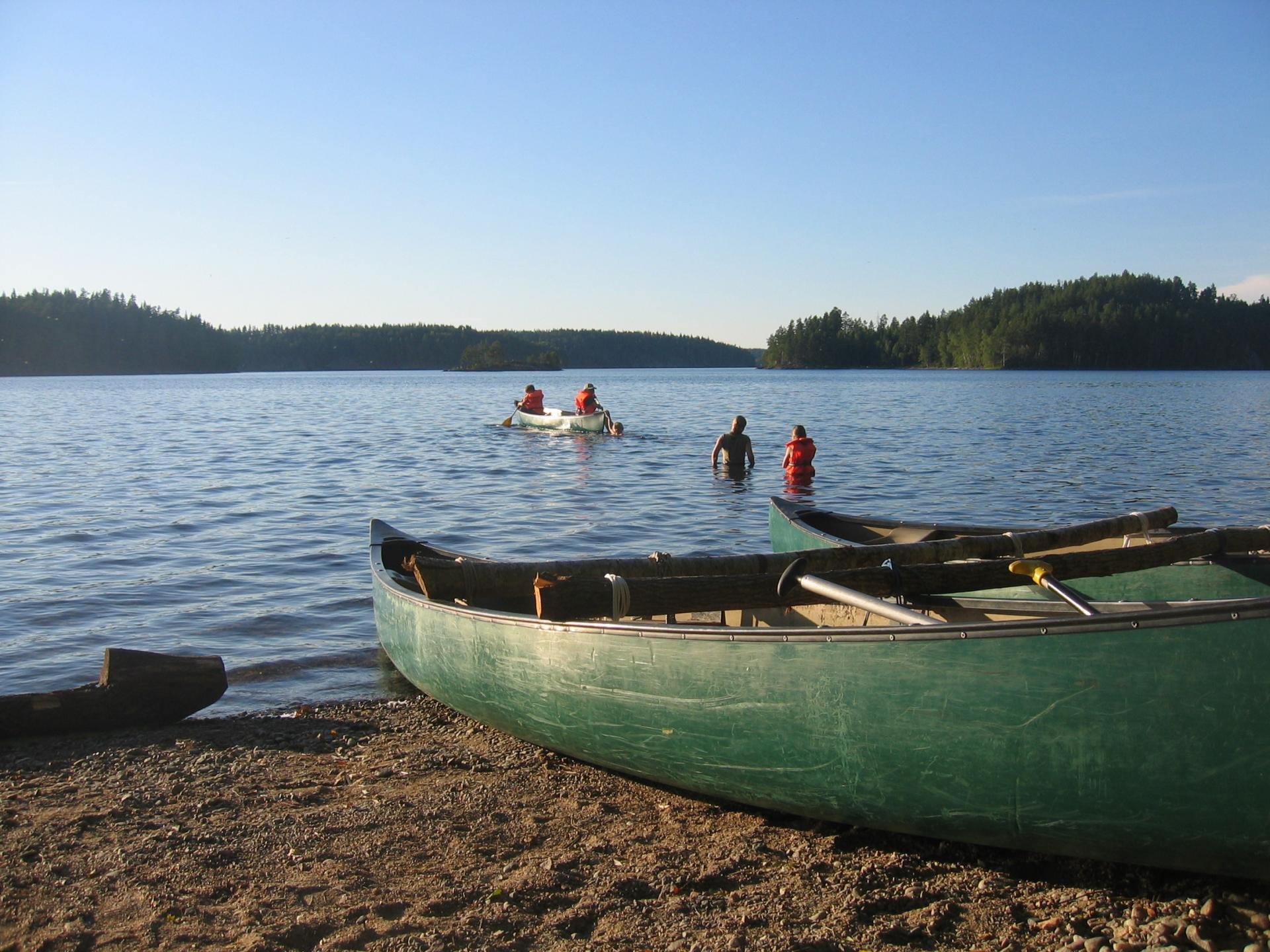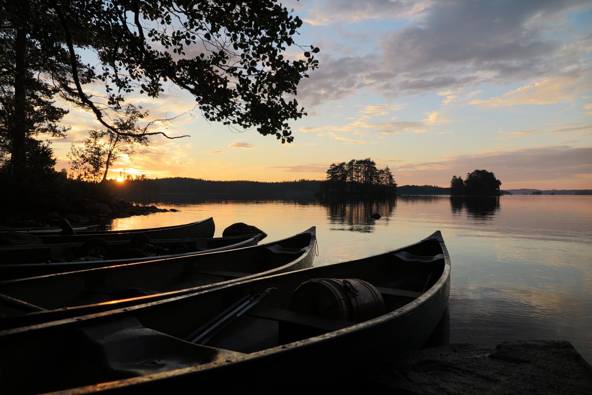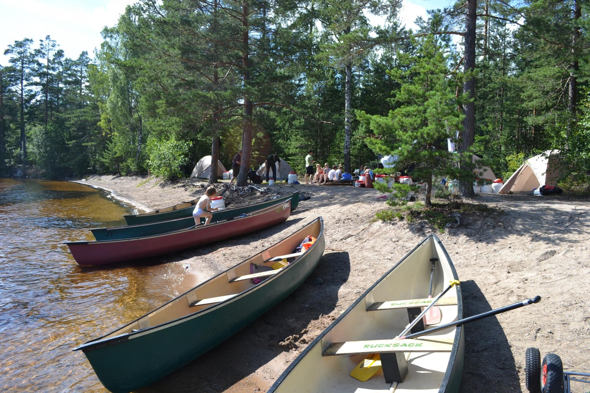 Unsere Gruppe trifft sich am Samstag um 15:00 Uhr in der Kanubasis am Kanucamp Rök am See Östra Silen. Hier stellt sich unserer Tourenbegleiter vor und wir lernen gemeinsam unsere Ausrüstung und unsere neuen Gefährten, die Kanus, kennen. Unser Guide erklärt die beste Rudertechnik und bespricht außerdem ein paar Verhaltensregeln für die kommenden Tage mit uns. Dann werden die Ausrüstung und Verpflegung, die wir in den nächsten Tagen benötigen, in wasserdichte Tonnen und Säcke verpackt. Die erste Nacht verbringen wir direkt am Wasser, wo wir schon mal üben, wie man die Schwimmwesten anlegt und die Boote steuert. Wir bauen unsere Zelte auf und kochen gemeinsam unser erstes Abendessen.