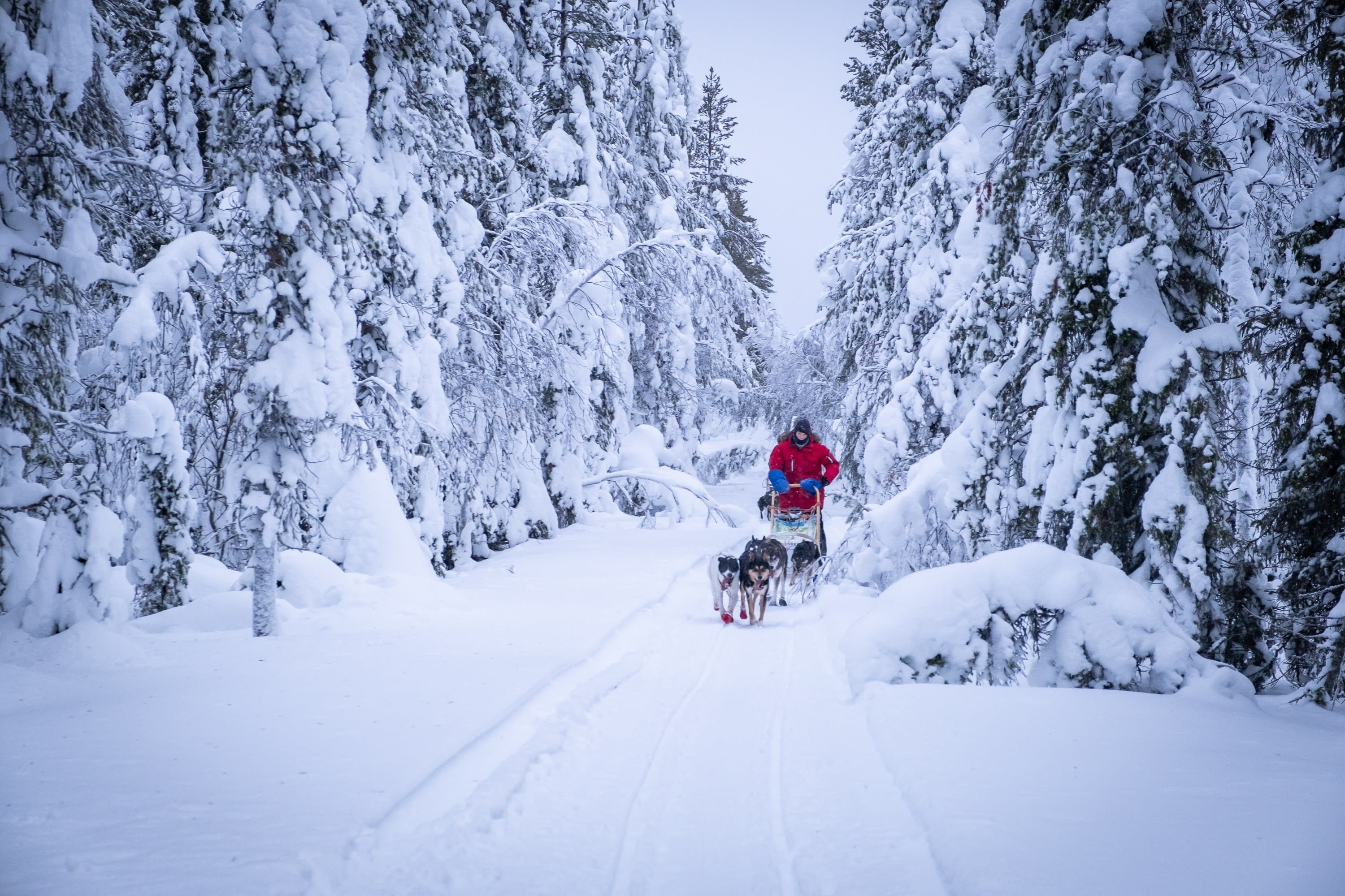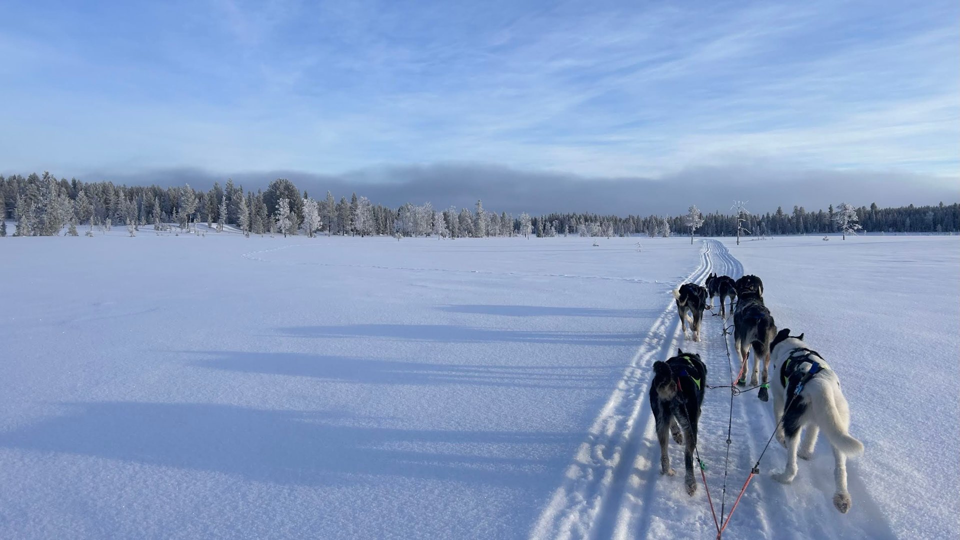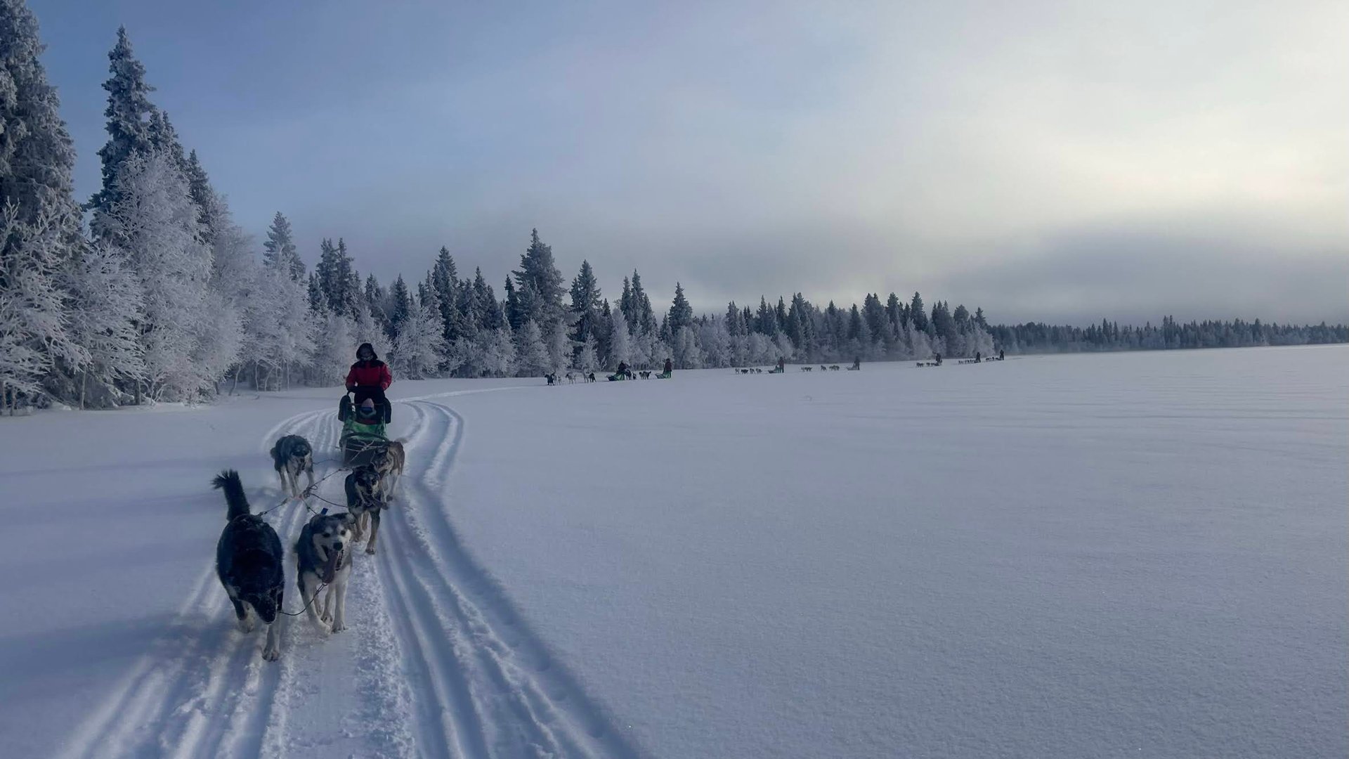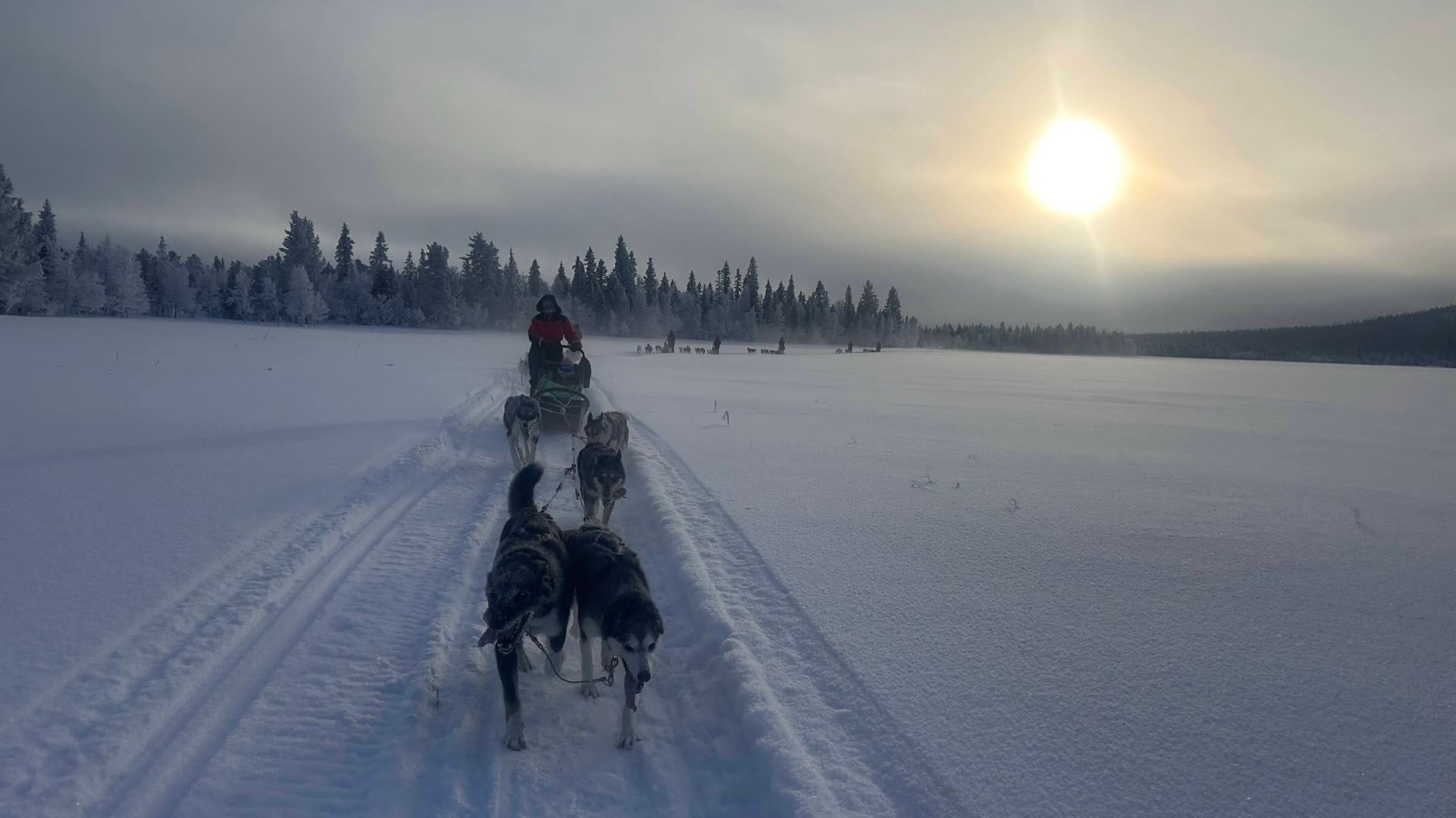Gut gestärkt starten wir in unser großes Abenteuer: Eine zweitägige Hundeschlitten-Tour, die uns tief in die wilde nordschwedische Natur führt. Wir legen weite Strecken zurück und fahren stundenlang durch unberührte Schneelandschaften – vorbei an weiten Ebenen, durch dichte Wälder und über zugefrorene Flüsse. Der Winter hat die Landschaft in ein magisches Reich aus Eis und Schnee verwandelt.