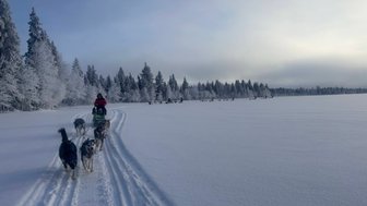 Wir fahren durch die verschneite Winterlandschaft rund um Storberg, über zugefrorene Seen und durch verzauberte Wälder. Bei einer Pause in einer gemütlichen Wildnishütte gibt es etwas zu essen, bevor wir uns wieder auf den Rückweg zur Farm machen.